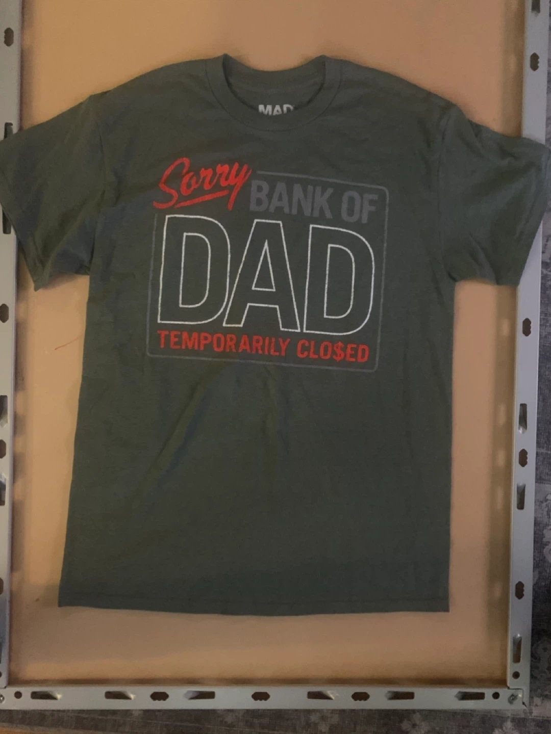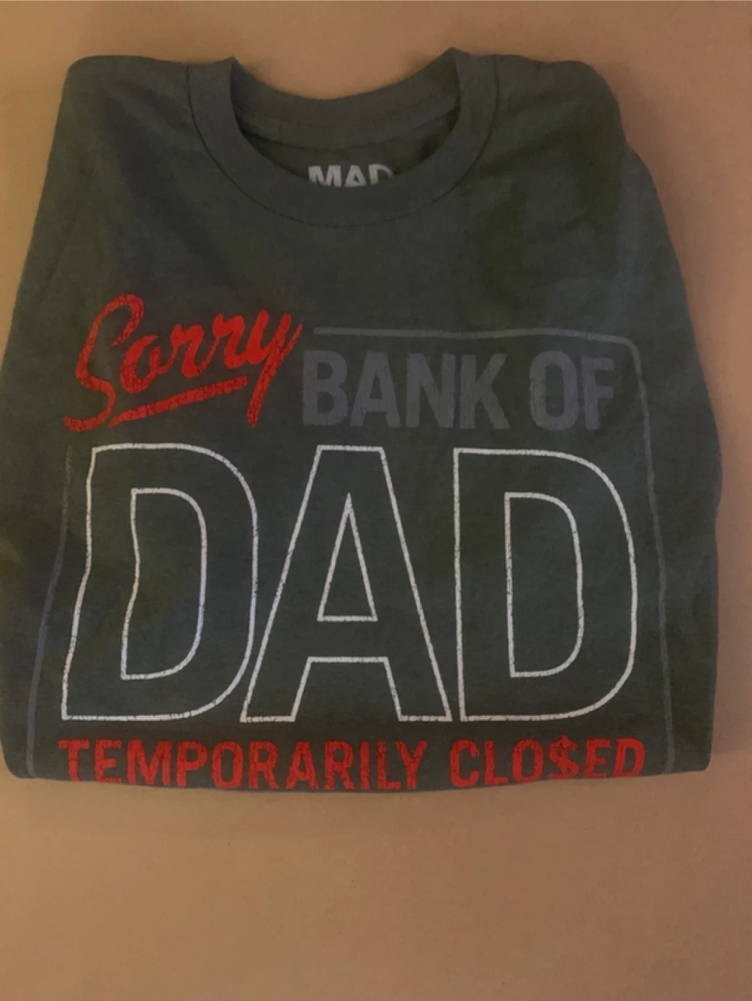 This MAD brand t-shirt features a "Sorry, Bank of Dad, Temporarily Closed" graphic. It's a fun, casual tee. Great for dads or as a gift!