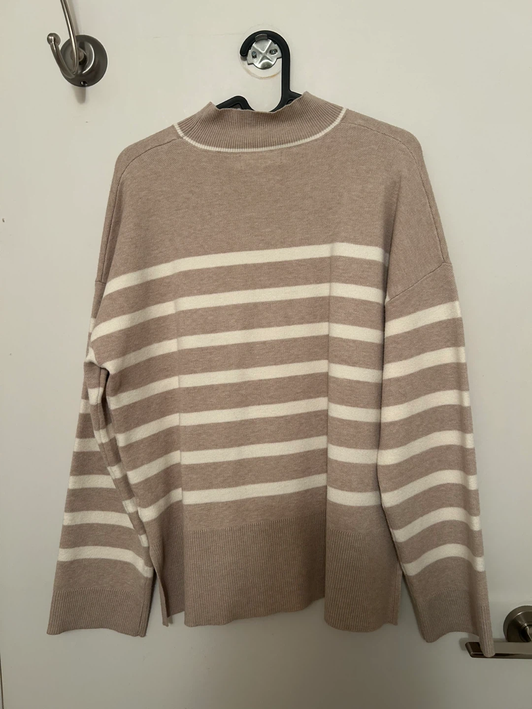 Cozy striped mock neck sweater from Cynthia Rowley. Features a relaxed fit with side slits. Made from a soft knit material.