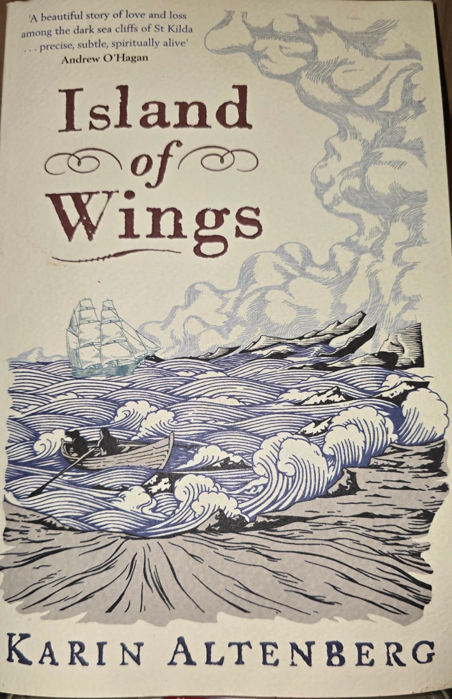 This book is titled 'Island of Wings' by Karin Altenberg. It's described as a beautiful story of love and loss among the dark sea cliffs of St Kilda. The narrative is noted as precise, subtle, and spiritually alive. A story set at sea with a sailing ship and a small rowboat.
