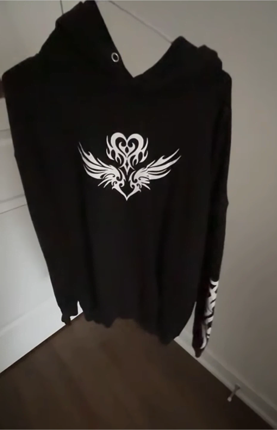 This black hoodie features a striking white graphic of a winged heart on the front and tribal-style designs on the sleeves. It's a comfortable and stylish pullover with a hood. Perfect for cooler weather or making a statement!