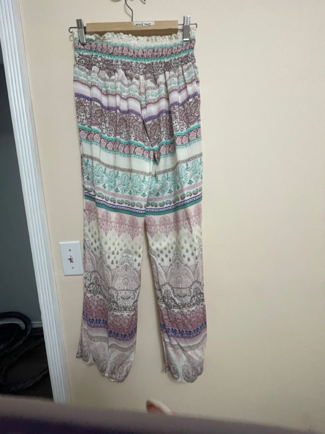 Printed pants with a smocked waist. The pants have a relaxed fit. Perfect for lounging around your home, on the beach or taking a stroll in the sun, they are made for comfort and relaxation.