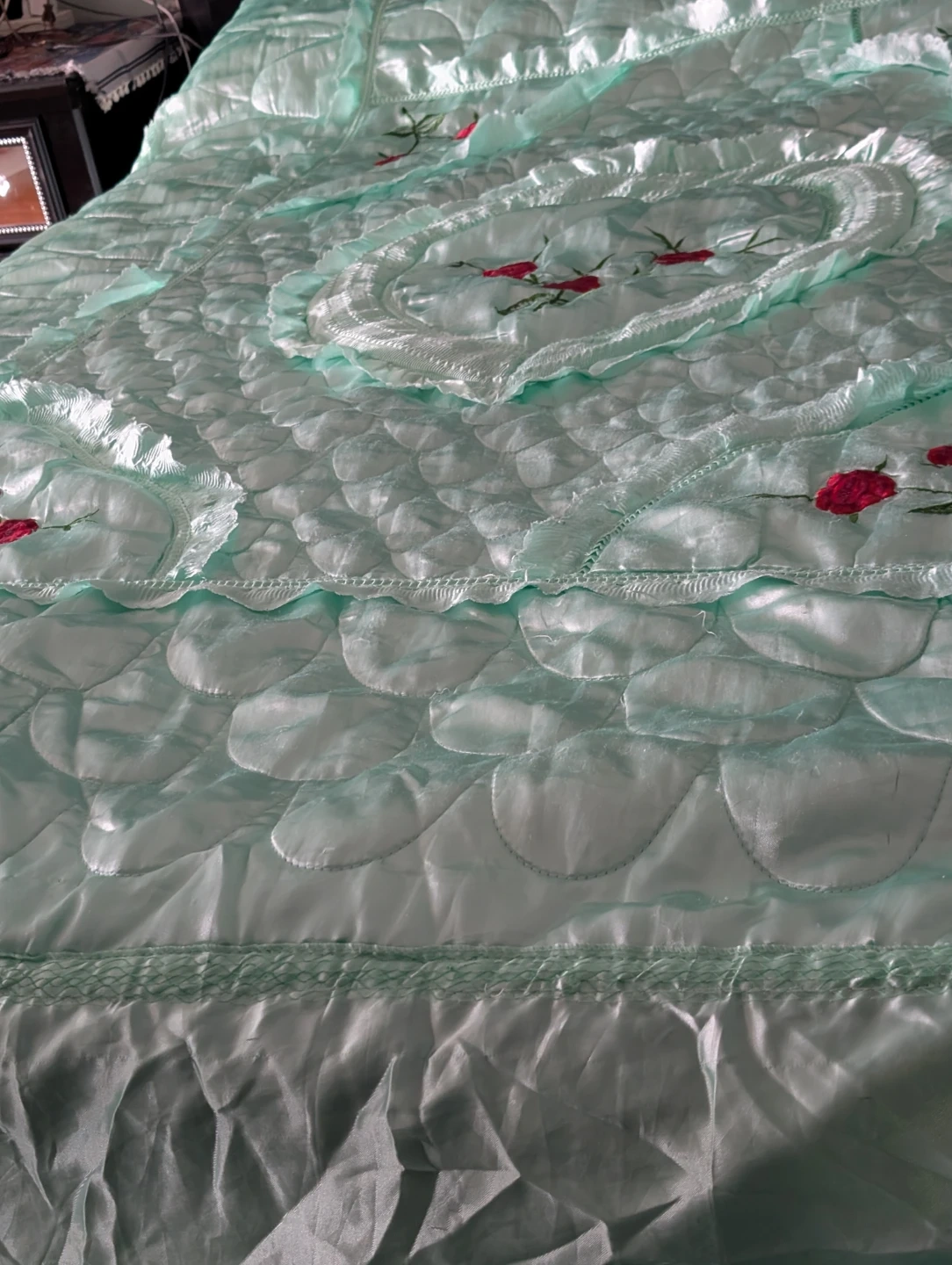 Lovely quilted bedspread set with embroidered floral details. It includes matching pillow covers and a decorative centrepiece. Available in various colours to match your decor.