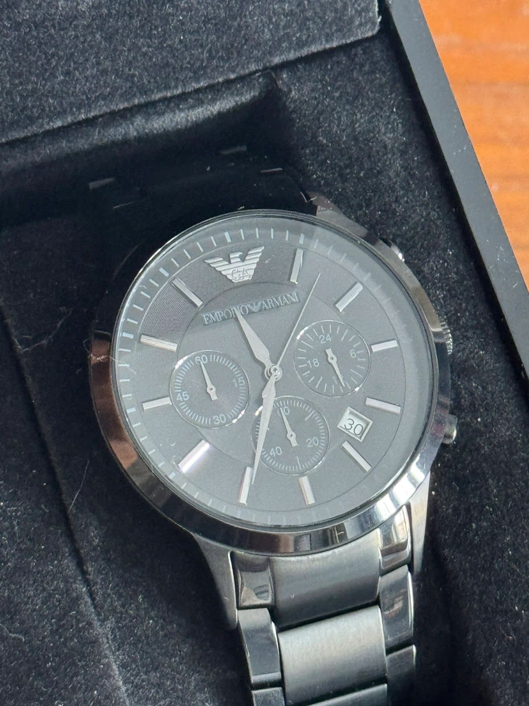 Men's Emporio Armani watch in a silver-tone stainless steel design. Features a black dial with chronograph subdials and a date display. It comes in its original presentation box.