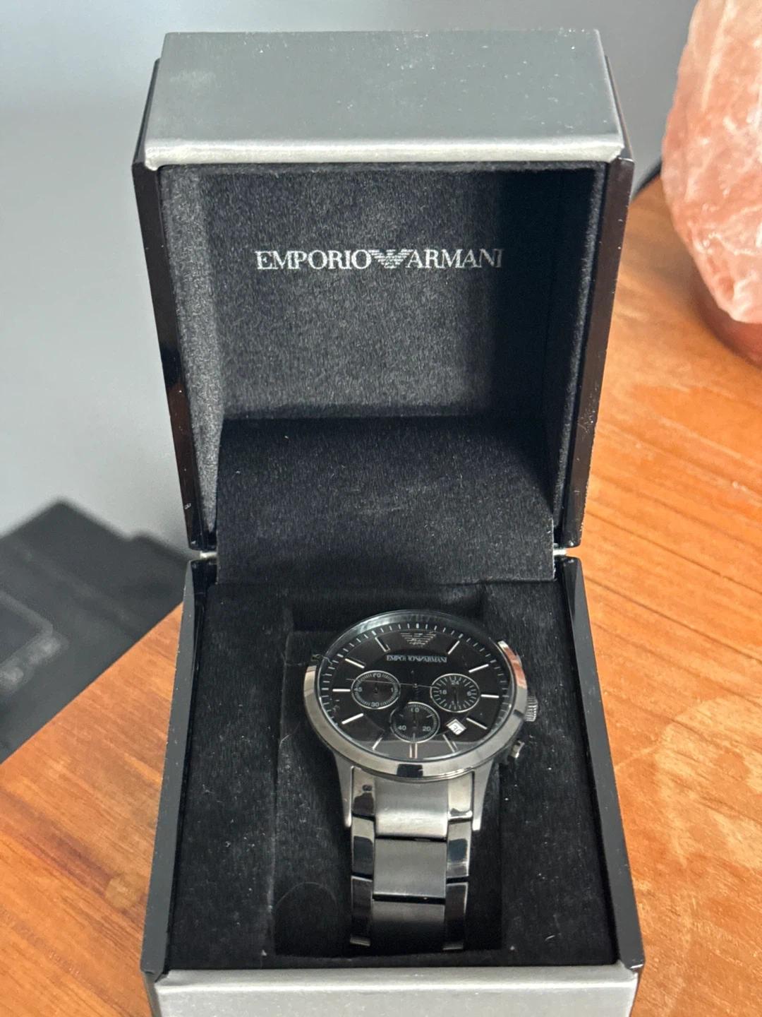 Men's Emporio Armani watch in a silver-tone stainless steel design. Features a black dial with chronograph subdials and a date display. It comes in its original presentation box.