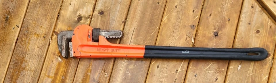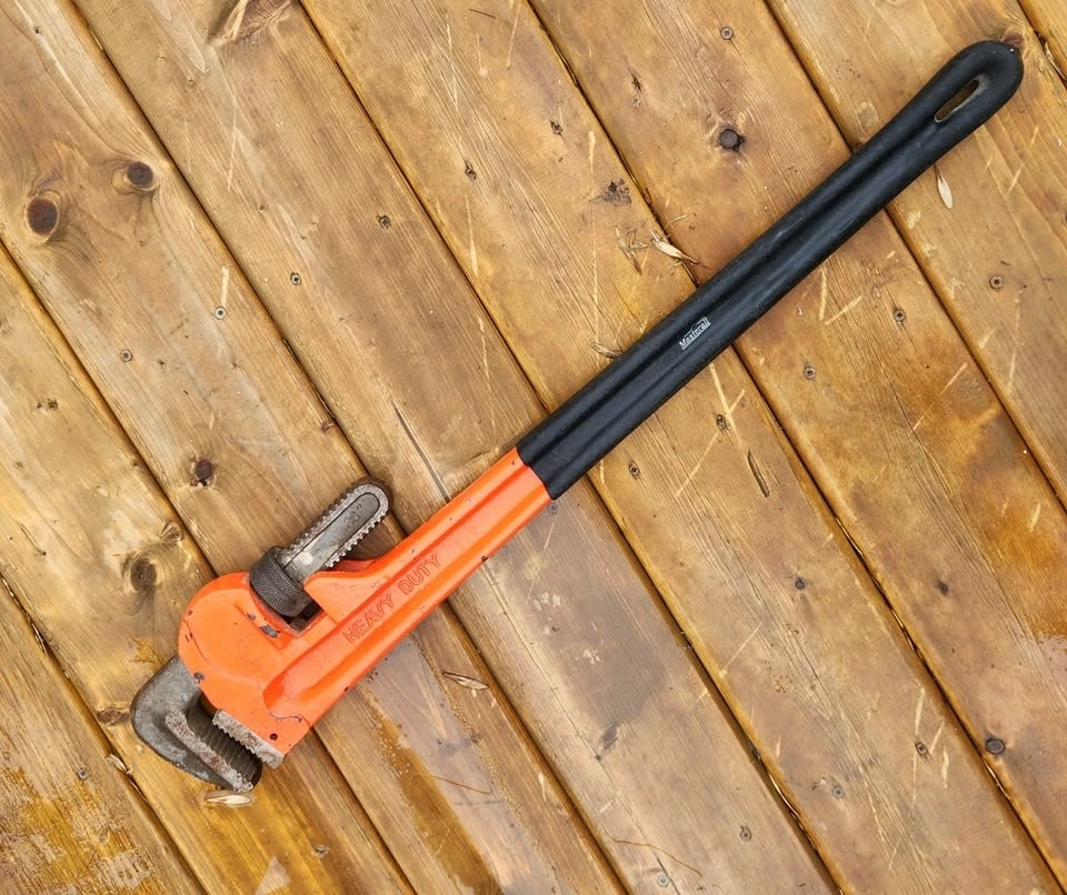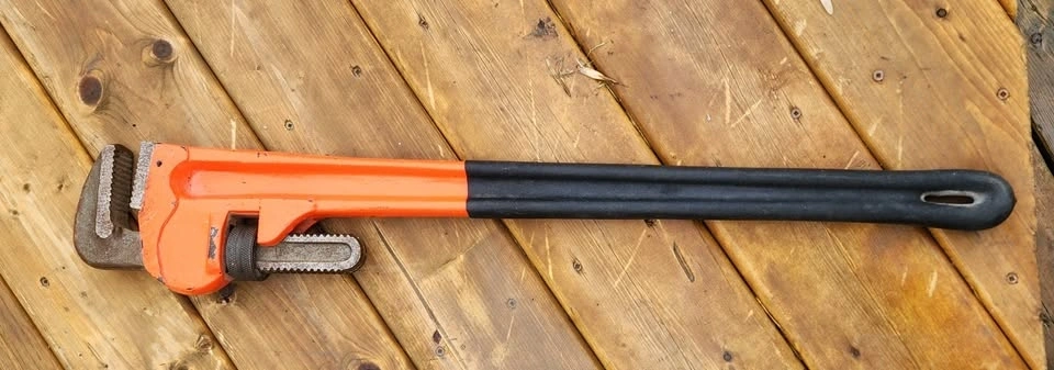 Industrial or heavy utility wrench, designed for plumbing, mechanical, and industrial applications. Features a serrated, adjustable jaw for a secure grip on pipes and fittings. The long handle provides high leverage for stubborn joints. Made of durable cast iron or forged steel to withstand demanding job site conditions. Its self-tightening grip increases with pressure. Essential for various plumbing tasks. The jaws have precision-milled, serrated teeth for a secure bite. Uses a floating hook jaw and knurled adjustment nut for quick resizing. This model has an orange-painted body with a non-slip black soft grip handle. NO RUST and in very good condition. CASH and FIRM price. Pickup near Western Hill area in St. Catharines.