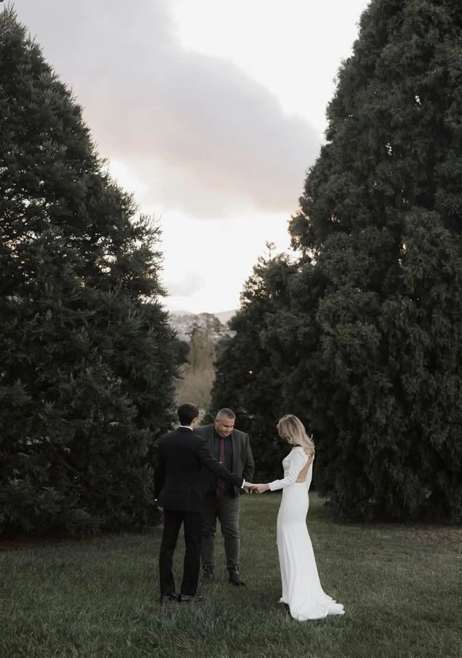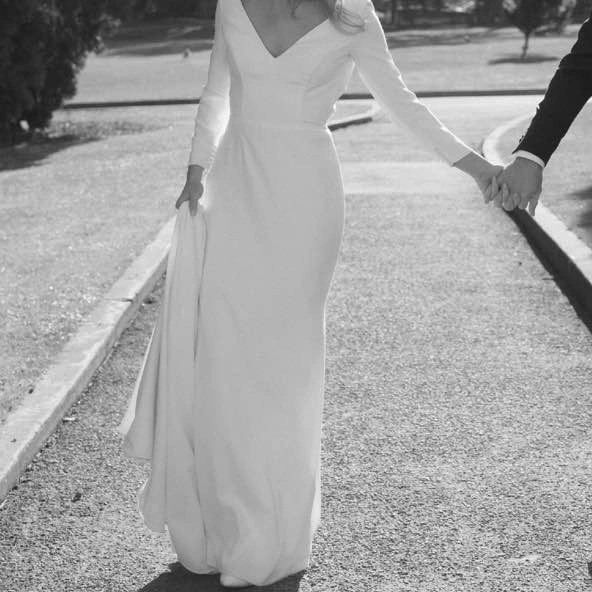 Mikaella Bridal dress style 2235 by Paloma Blanca, $2300 retail. Colour: Natural (closer to white than ivory). Crêpe Wedding Dress with V-neckline and long sleeves, fabric covered buttons on sleeve hem. Inverted V-back neckline with fabric covered button closure at neck. Optional beaded belt at waist. Fit and flare skirt with inverted seam at back of train. Perfect for a fall or winter wedding. Sleeves have been altered to 3/4 length but can be let back out if desired with all original buttons. Sleeve circumference near hem is 18cm (non-stretch fabric). A few tiny pulls on sleeves, but otherwise free of stains or damage. Recently dry cleaned and steamed. Approximately street size 4/6: Chest 90cm, Waist 75cm, Hips 97cm. Front hemmed for 5’9”.