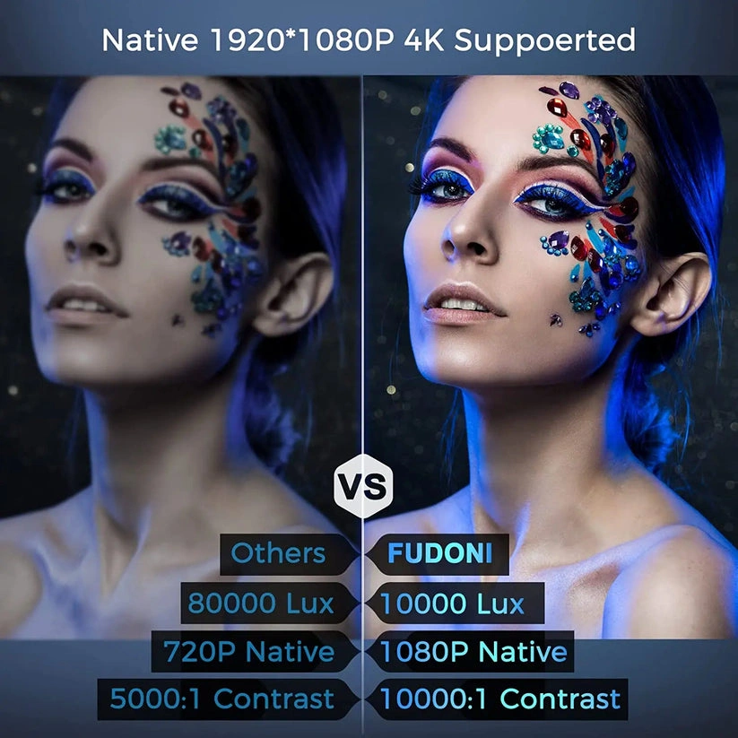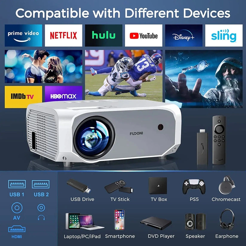 10【Fast Stable 5G WiFi & Bluetooth 5.0】- The projector with WiFi and Bluetooth provides 2.4G/5G dual-band WiFi connections, enabling you to synchronize your smartphone screen by both 2.4G and 5G WiFi. The ultra-fast 5G WiFi offers you a much smoother and lag-free online video streaming experience. Adopting Bluetooth 5.0, our projector allows you to connect various Bluetooth speakers, headphones, and other audio equipment to an immersive sound experience. 【1080P Full HD Projector】- With native 1920*1080, supported 4k resolution, the home theater projector is designed with the latest NTSC color technology to provide superior image quality in terms of brightness, contrast, and color fidelity. 10000 lumens of image quality and an ultra-high 10000:1 contrast ratio allow the projector for more realistic color reproduction and highlight darker details, tiny details can be captured on the big screen, bringing you a shocking, immersive viewing experience. 【300" Giant Screen & 50% ZOOM Function】- The WiFi projector offers a 32"- 300 " projection size with a projection distance between 3.6ft-32.8ft, allowing you to get the best viewing effect in your home theater(Including the 100'' projector screen, even outdoors we can easily enjoy a movie feast). With a 50% zoom function, you can reduce the image size from 100% to 50% without moving the movie projector. It can also support front, rear, and ceiling installation, you can install it as you need. 【Compatible with Multi Devices】- The Bluetooth projector provides HDMI/2*USB/AV port/3.5mm audio port, which can connect with a TV stick, Smartphone, Laptop, Chromecast, DVD Player, external speakers, PS4, USB flash, etc. Easily meet your movie, match, and game needs. (Due to copyright issues, it can't support watching videos on Netflix, Prime Video, Hulu, Disney, etc while screen mirroring, but it will work well by HDMI connection if you use the TV Stick or Roku Express.) 【Built-in HiFi Stereo Speakers & Detachable Dust Filter】- This home theater projector is equipped with HiFi stereo speakers, it provides you with original audio fidelity, restores every detailed sound effect, and allows you to enjoy the ultimate auditory feast! With a detachable dust filter, the projector can prevent dust from entering the machine or falling on the lens, reducing fan blockage and light bulbs being dusted and extending the user's life.