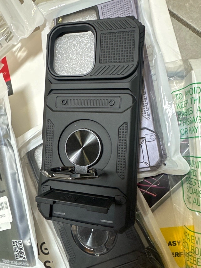This heavy-duty armor case offers military-grade protection for your smartphone. It features a dual-layer, impact-resistant design with a non-slip texture for a secure grip. The integrated 360° rotating ring holder doubles as a kickstand for hands-free viewing and also makes it compatible with magnetic car mounts. Reinforced corners and a raised bezel protect the screen and camera. Exact cutouts ensure full access to all ports and buttons. New condition. Cash and cashless payments accepted. Curbside pickup available.
