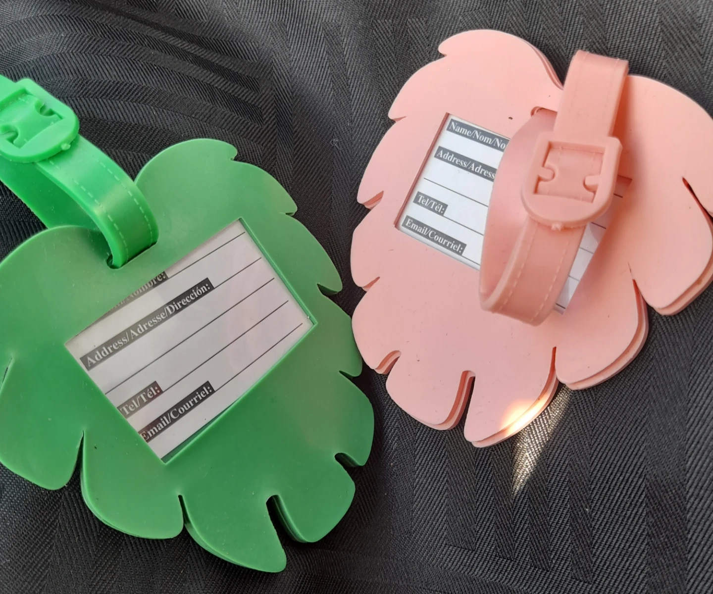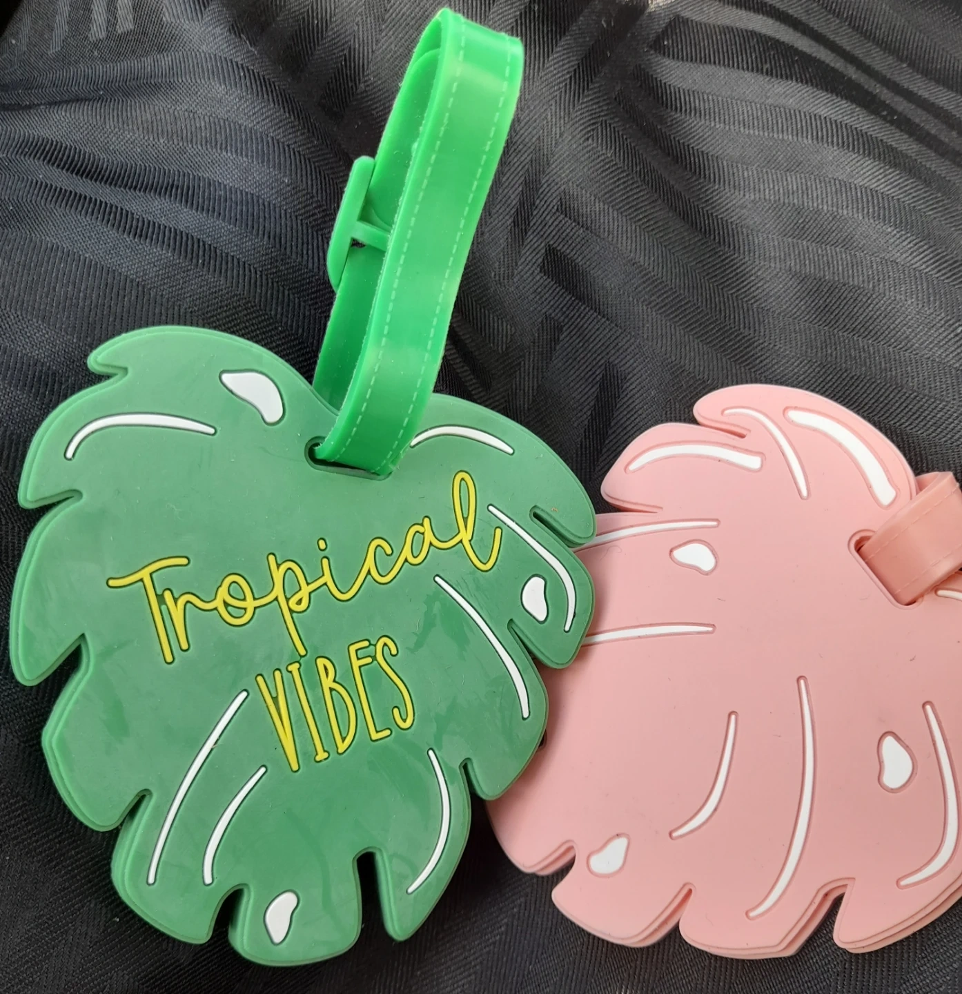 Brightly coloured leaf-shaped luggage tags, one green with "Tropical Vibes" and one pink. They're made of flexible material and include space for your name, address, and phone number. Perfect for easily spotting your bags on a trip!