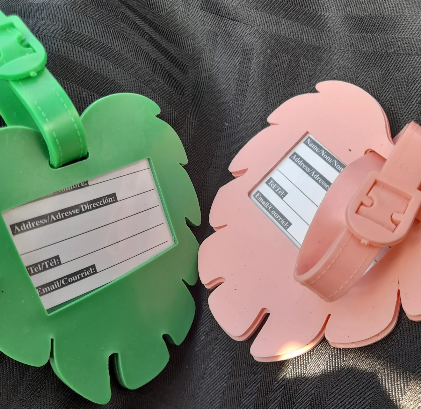 Brightly coloured leaf-shaped luggage tags, one green with "Tropical Vibes" and one pink. They're made of flexible material and include space for your name, address, and phone number. Perfect for easily spotting your bags on a trip!