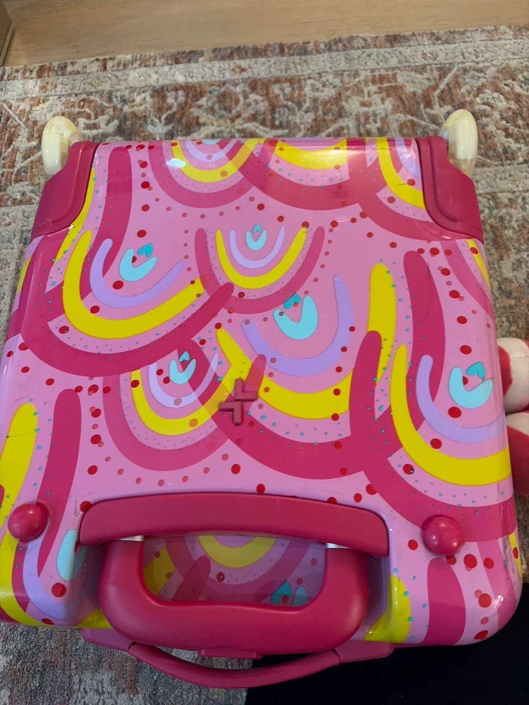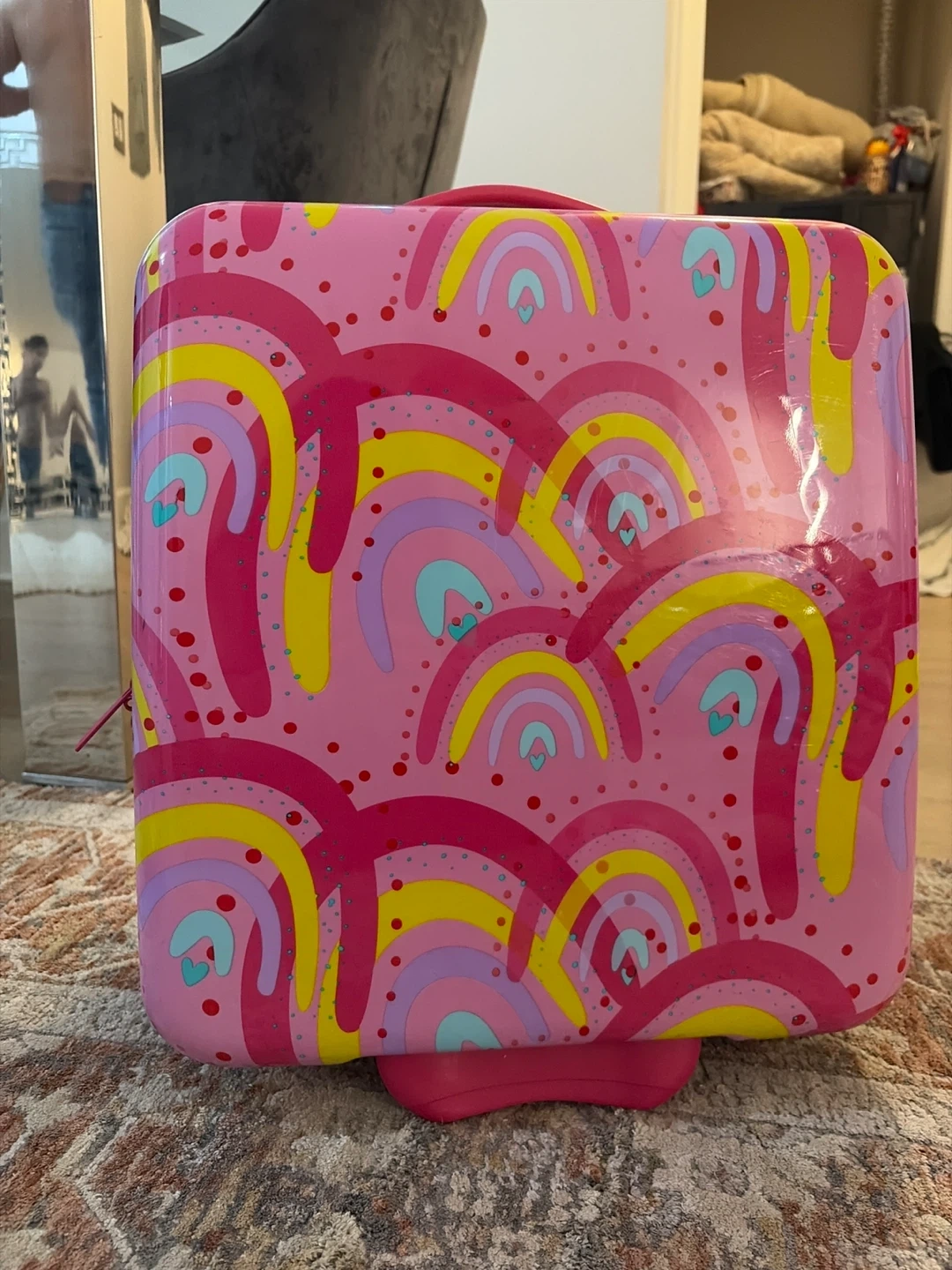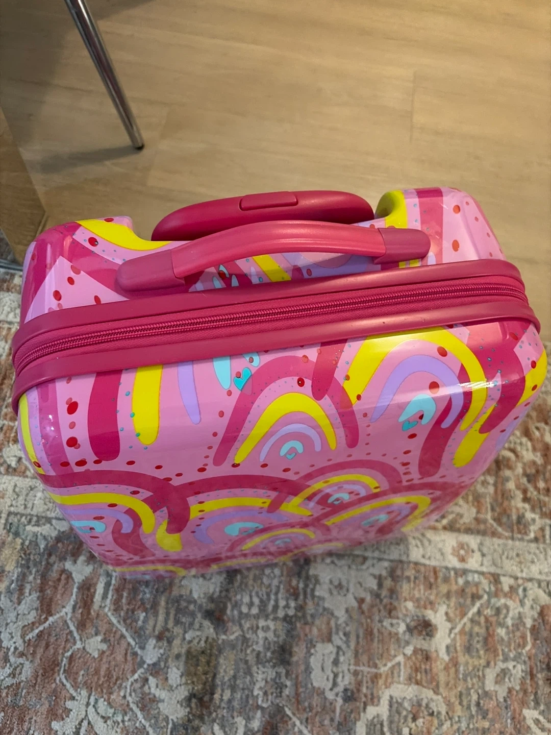 Cute pink suitcase covered in a colourful rainbow pattern. It has a retractable handle and wheels for easy transport. Perfect for little travellers on their adventures!