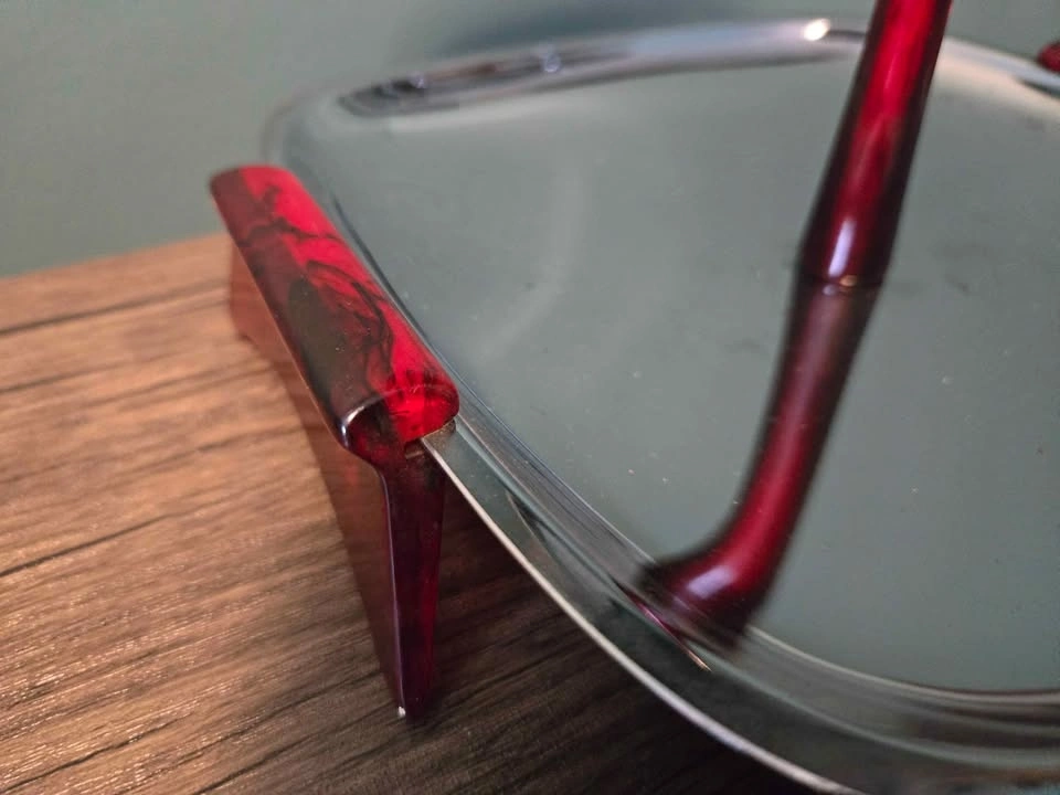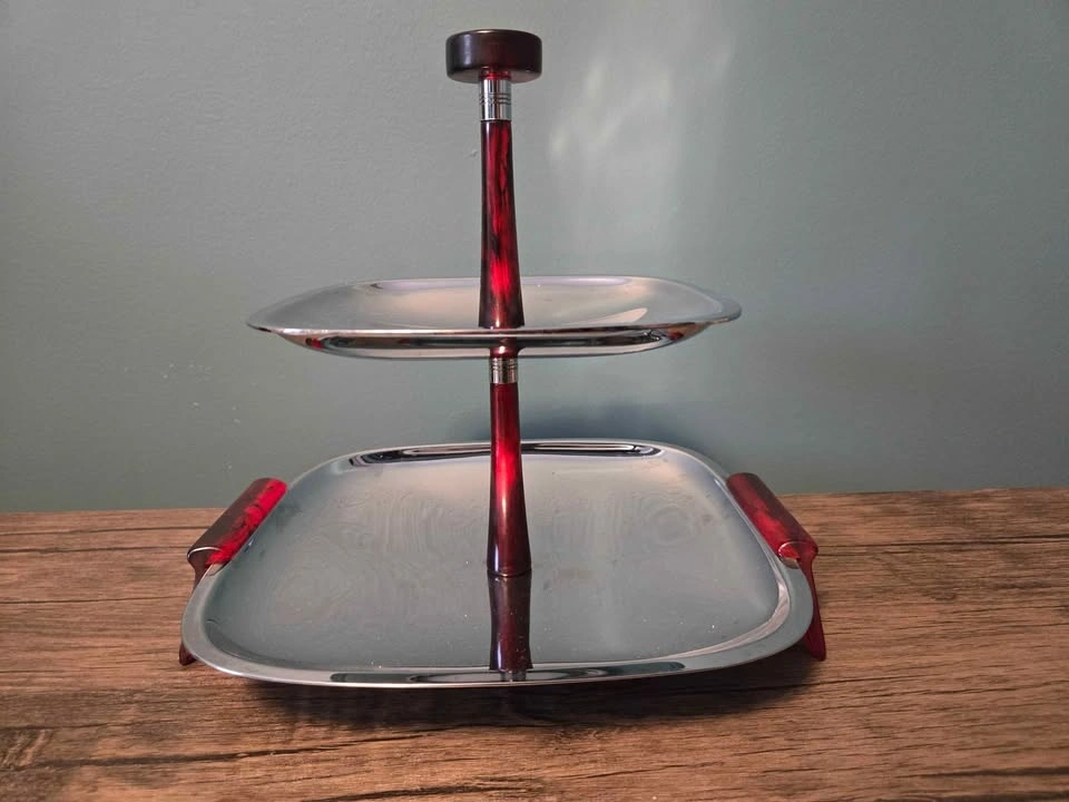 Charming two tier serving tray. Shiny silver-colored square trays. Red marbled BAKELITE handles and center support. Great for snacks, desserts, or just displaying things. Pick up Upper Kenilworth and Mohawk area on the East Hamilton mountain.