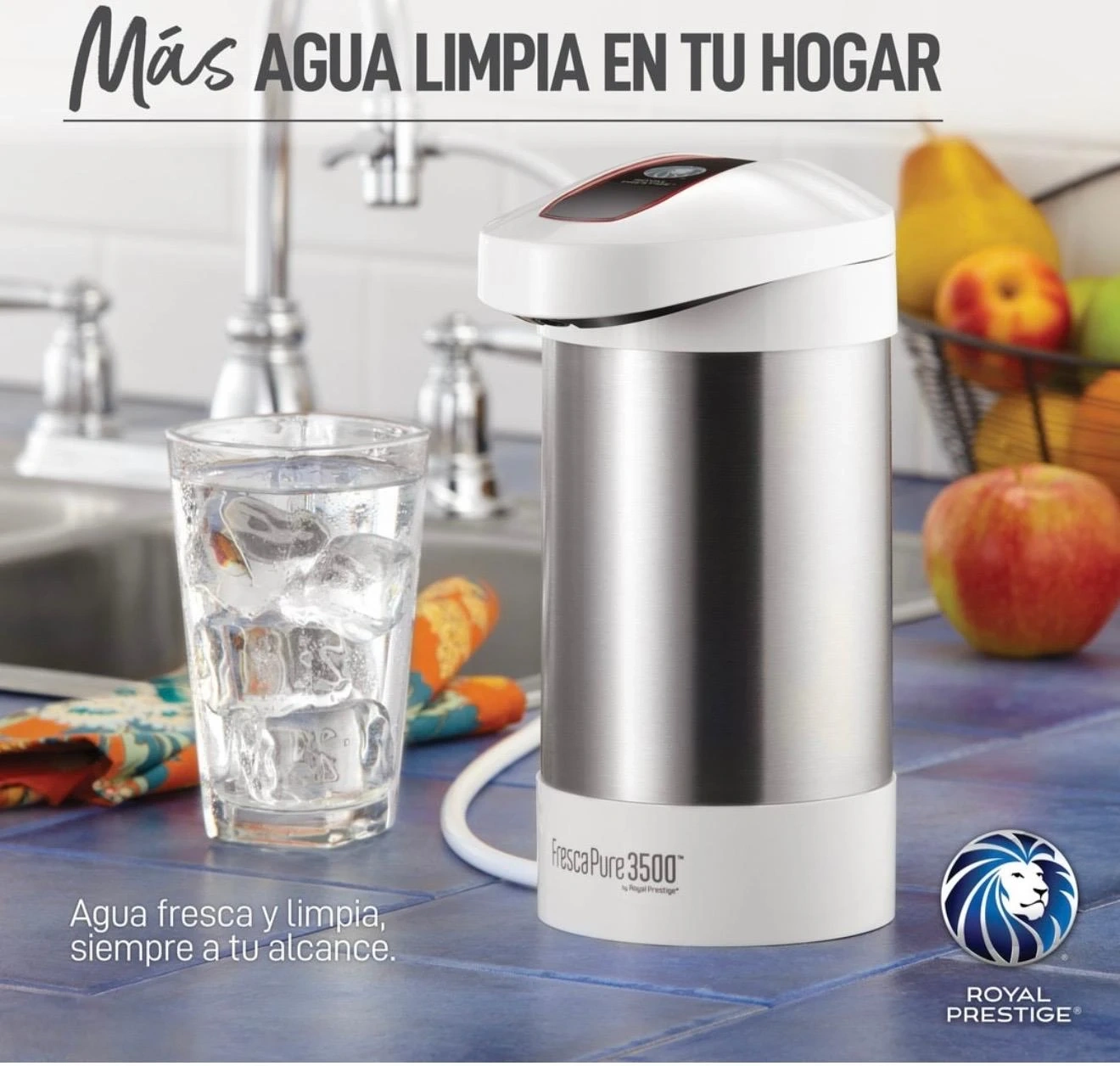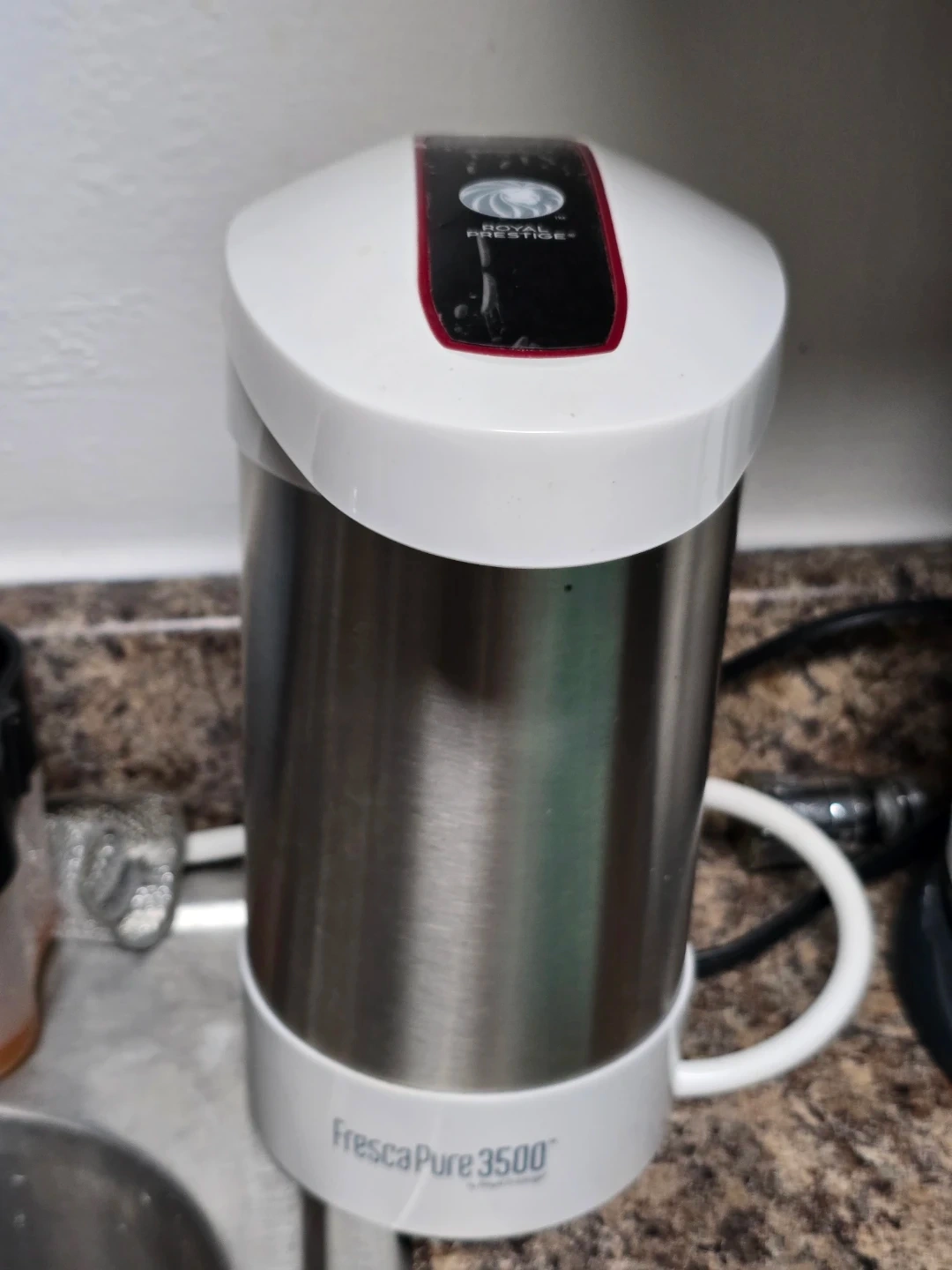 This Royal Prestige FrescaPure 3500 is a water purifier. It's made with stainless steel and white plastic accents. Get clean water right at home!