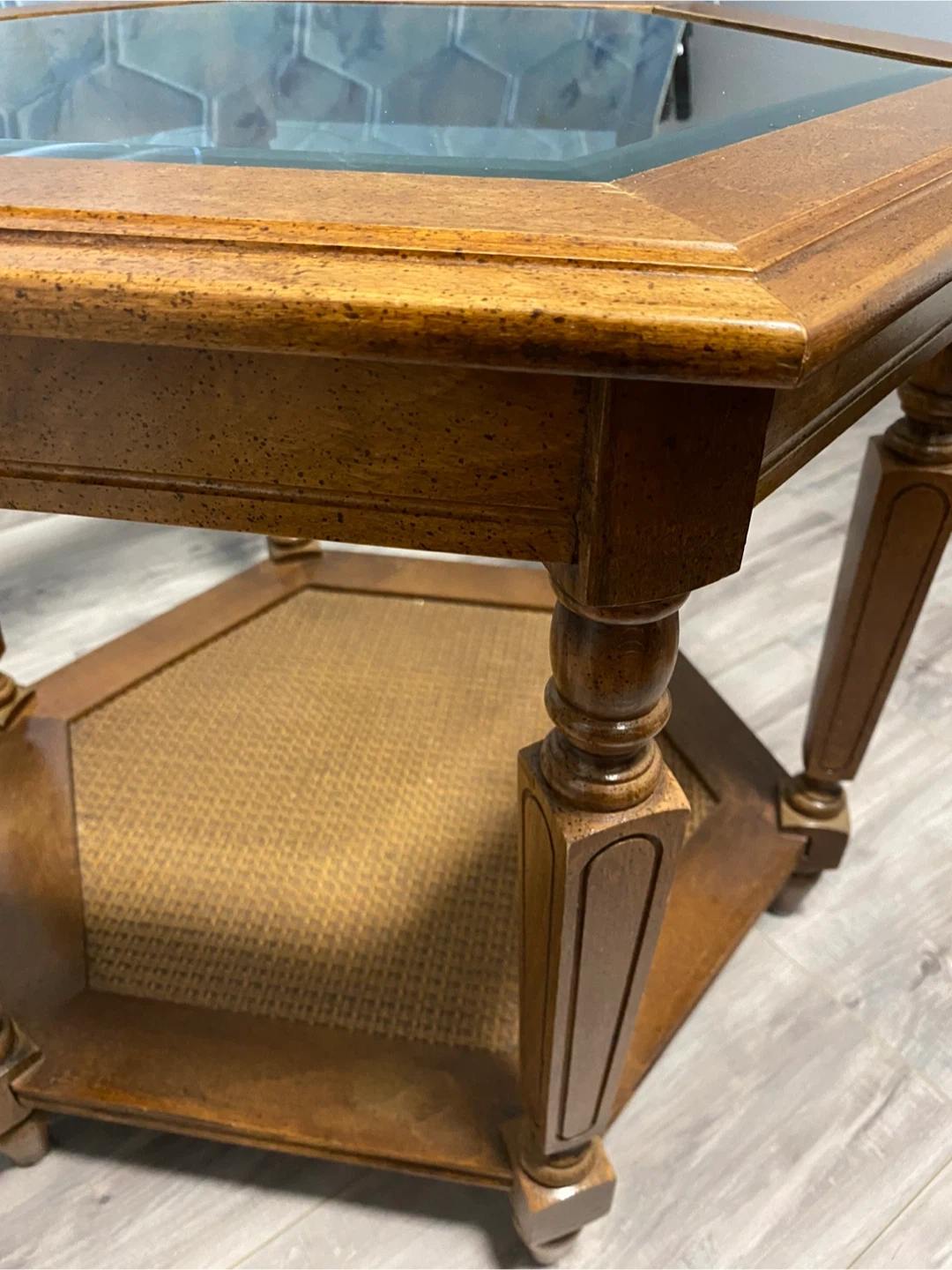 This is a hexagonal end table featuring a glass top and a lower shelf with woven cane detailing. It's made of wood with a natural finish and has decorative turned legs. It's a stylish piece for any living room!