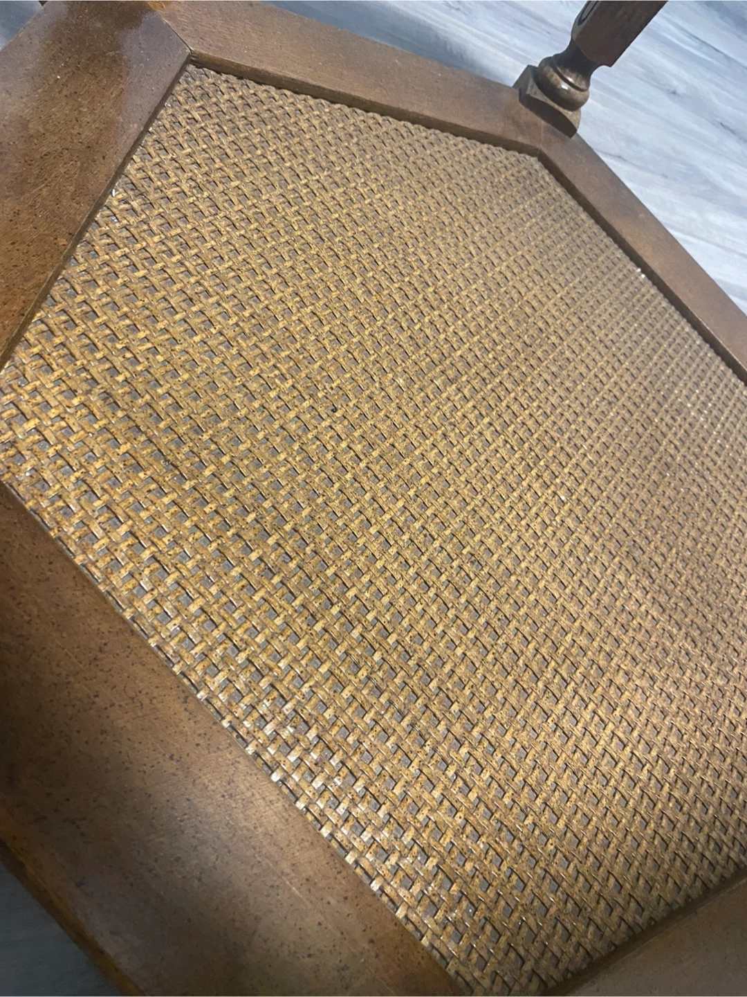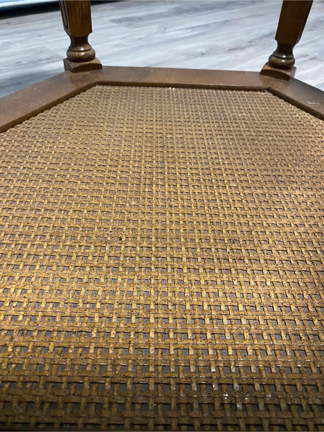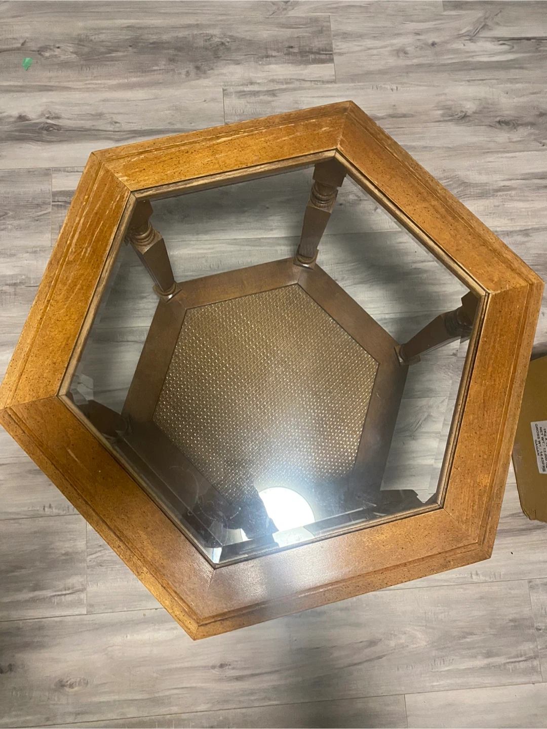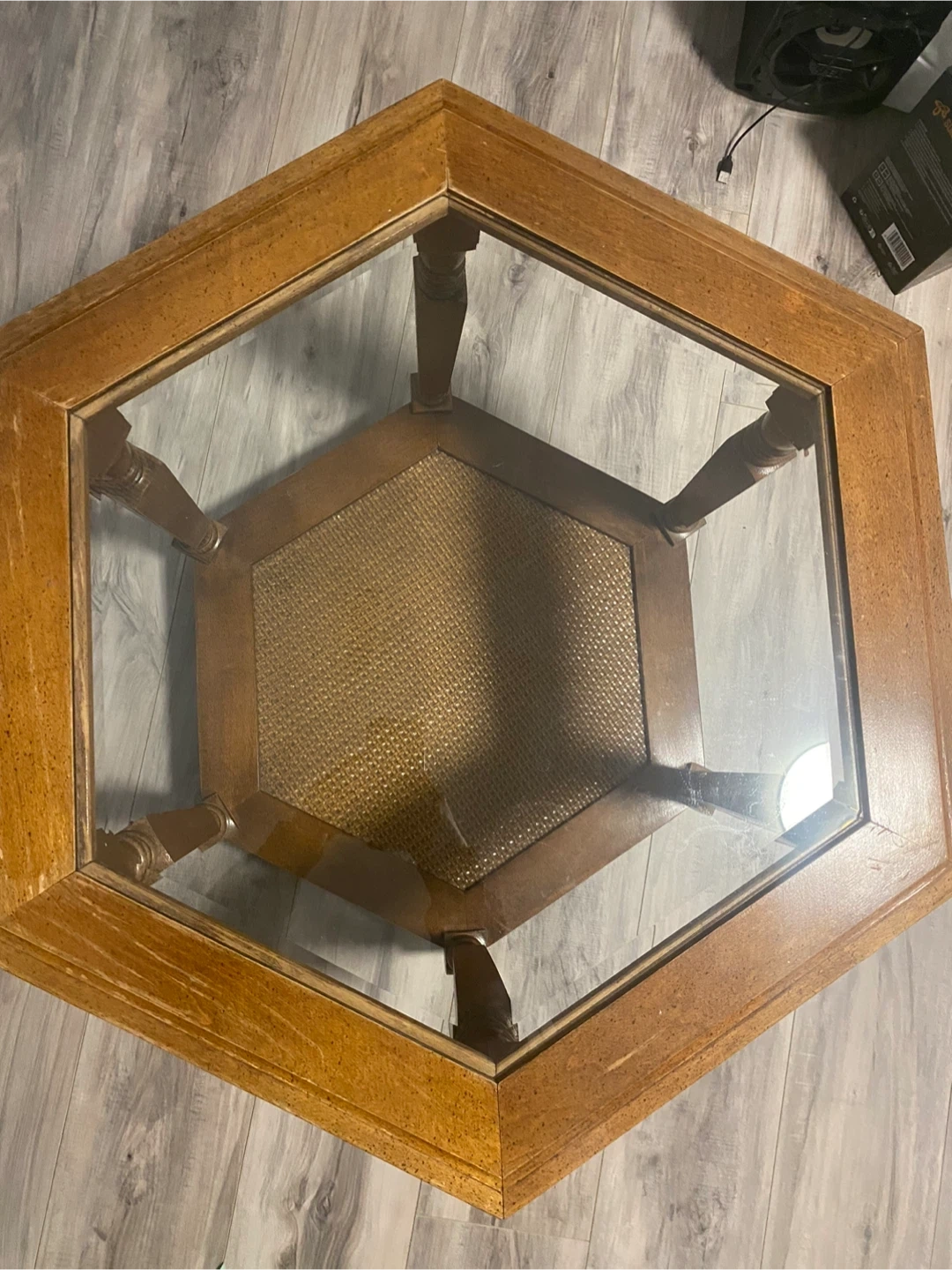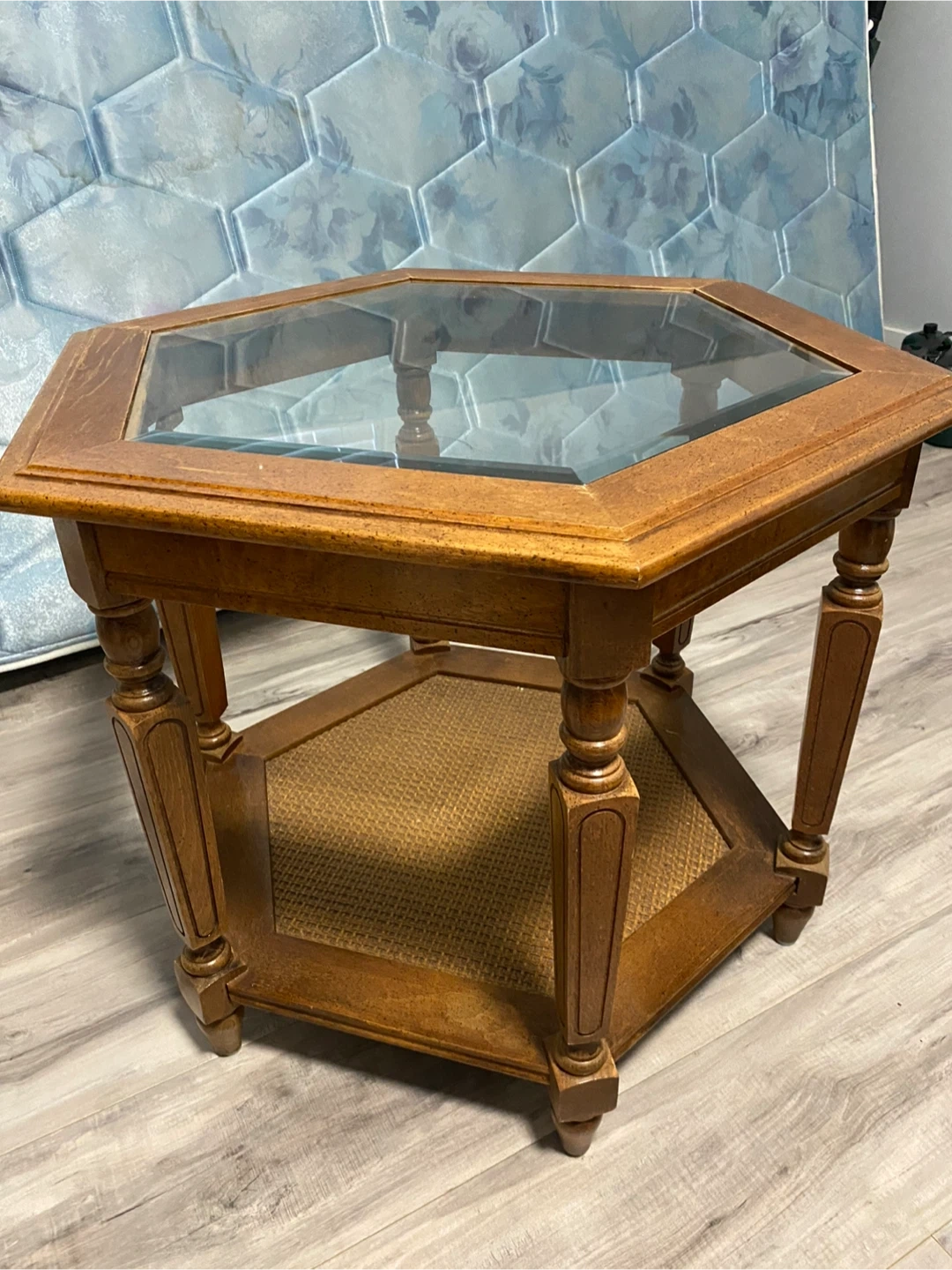 This is a hexagonal end table featuring a glass top and a lower shelf with woven cane detailing. It's made of wood with a natural finish and has decorative turned legs. It's a stylish piece for any living room!