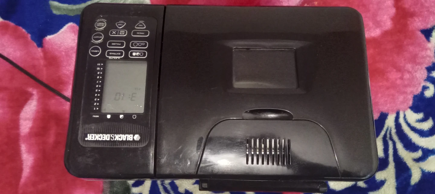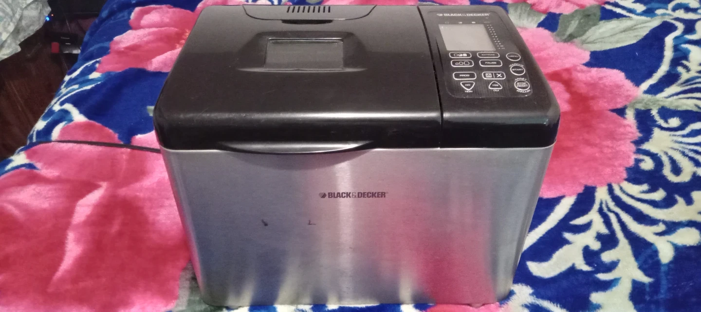 This BLACK+DECKER automatic bread maker helps you bake fresh bread at home. It has multiple settings for different bread types. Stainless steel exterior.
