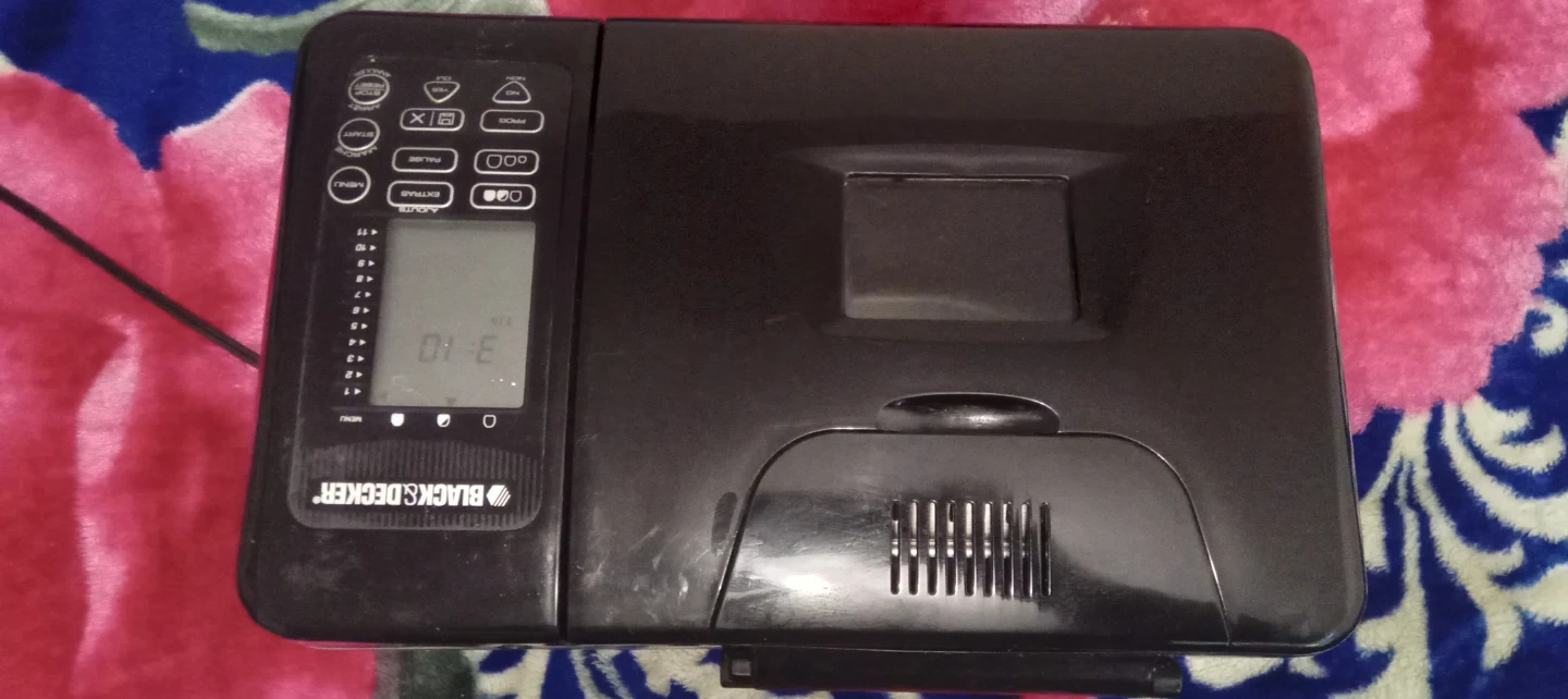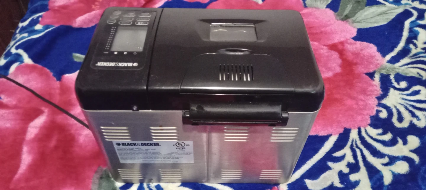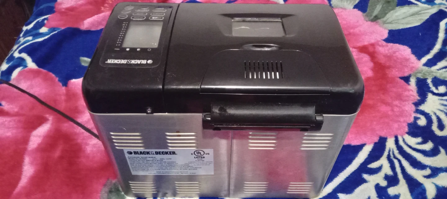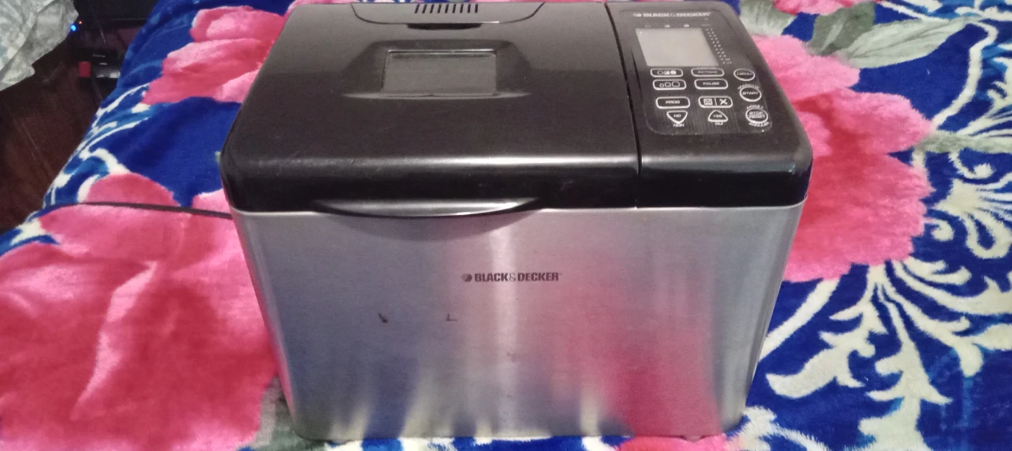This BLACK+DECKER automatic bread maker helps you bake fresh bread at home. It has multiple settings for different bread types. Stainless steel exterior.