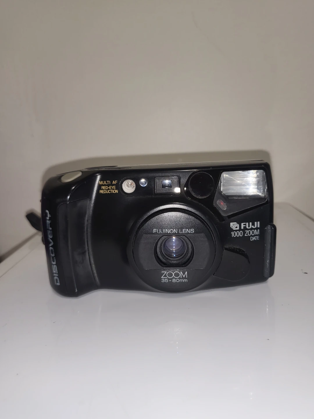 112Selling a Fuji Discovery 1000 Zoom Date camera. It has a Fujinon lens and a zoom range of 35-80mm. It also features multi AF red-eye reduction. Comes with a new battery, case and a roll of film.