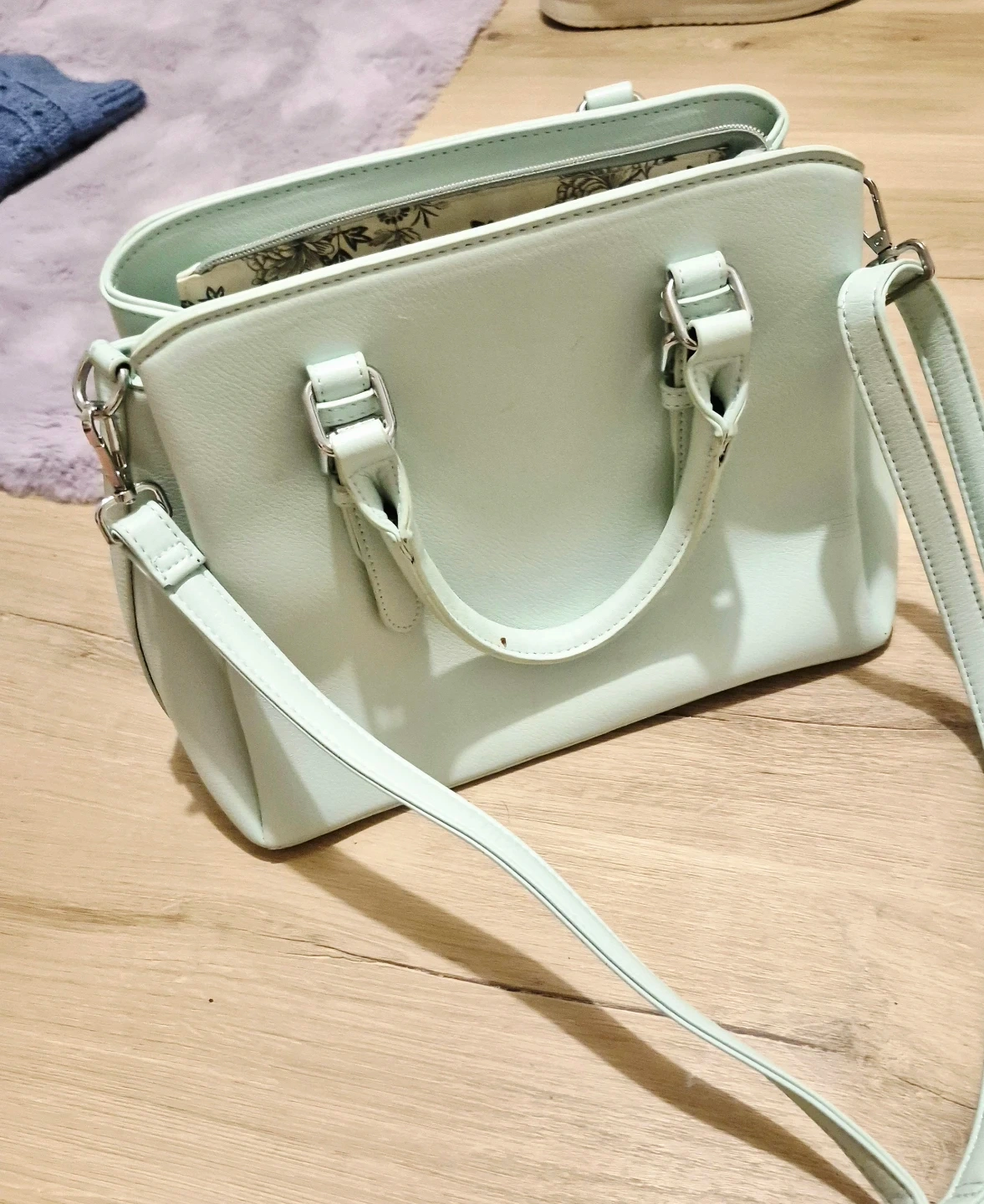 This satchel handbag is a lovely pale mint green colour. It has a floral patterned lining inside for a pretty touch. Includes a detachable shoulder strap for versatility.