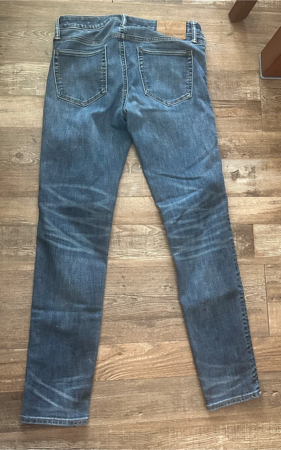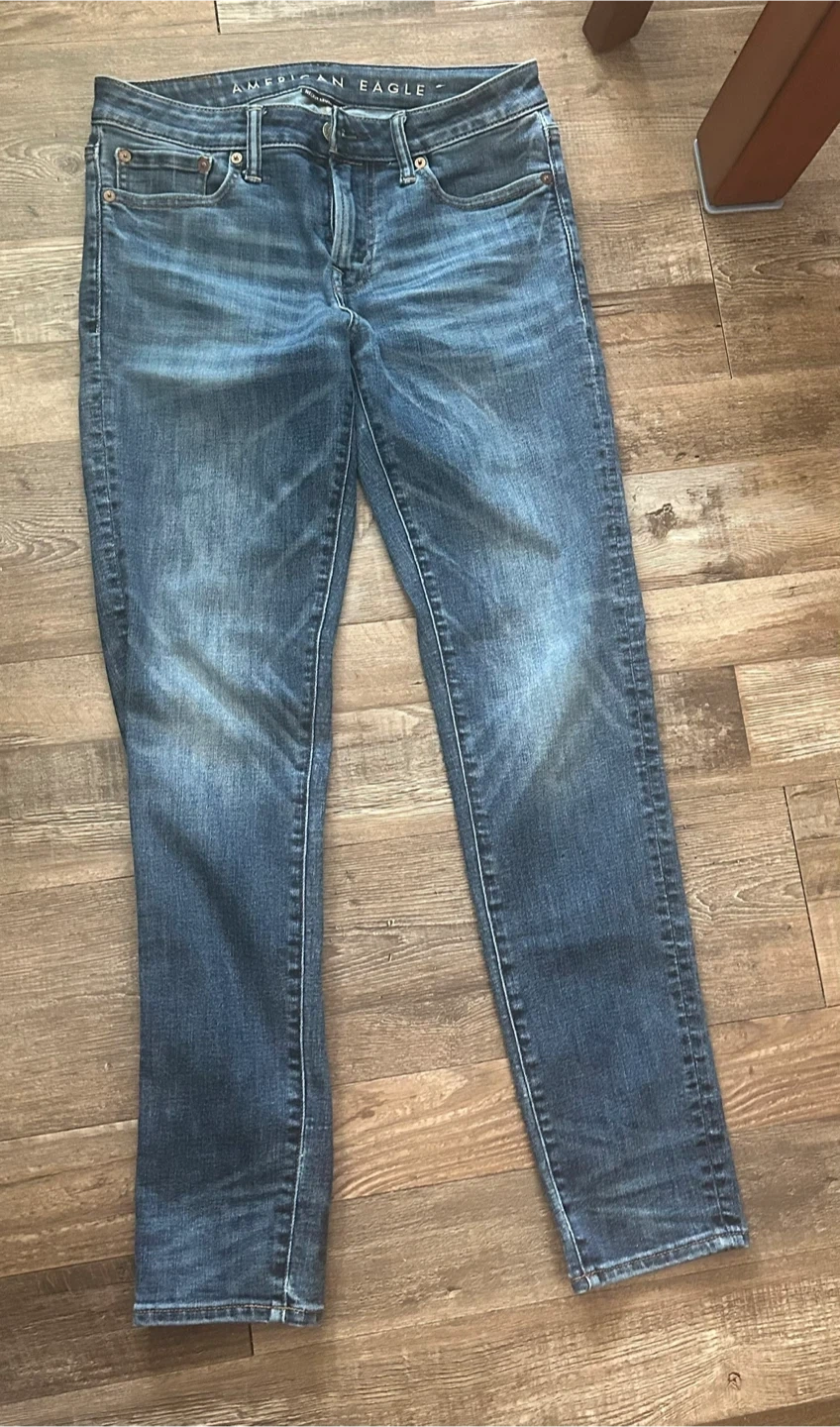 These are men's jeans from American Eagle. They feature a distressed blue wash. Made with flexible fabric for comfort.