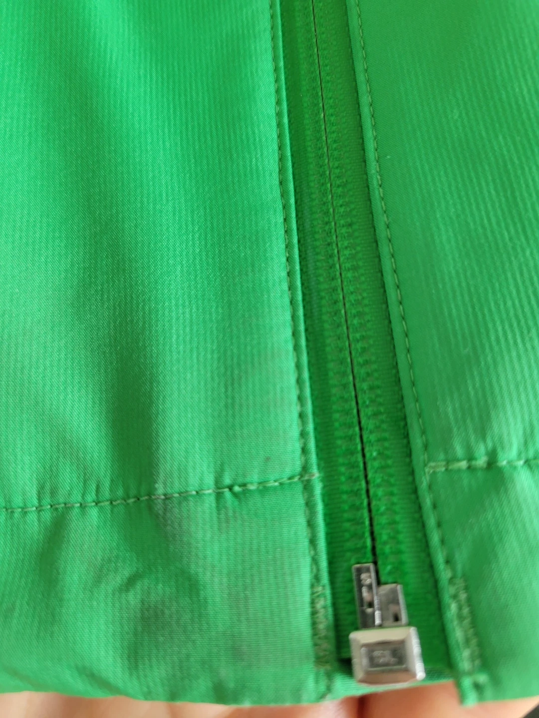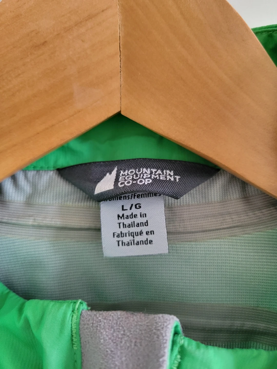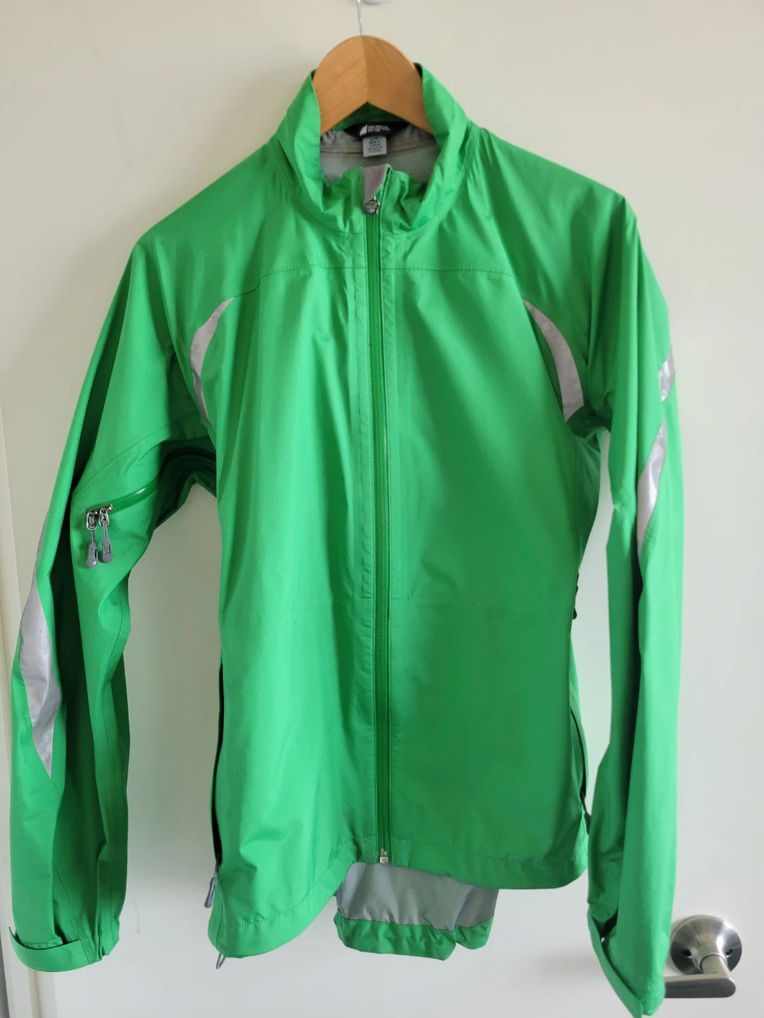 Mountain Equipment Co-op bike jacket, women's size L. Has a few small stains but still in good shape. Has reflective strips and underarm zippers.