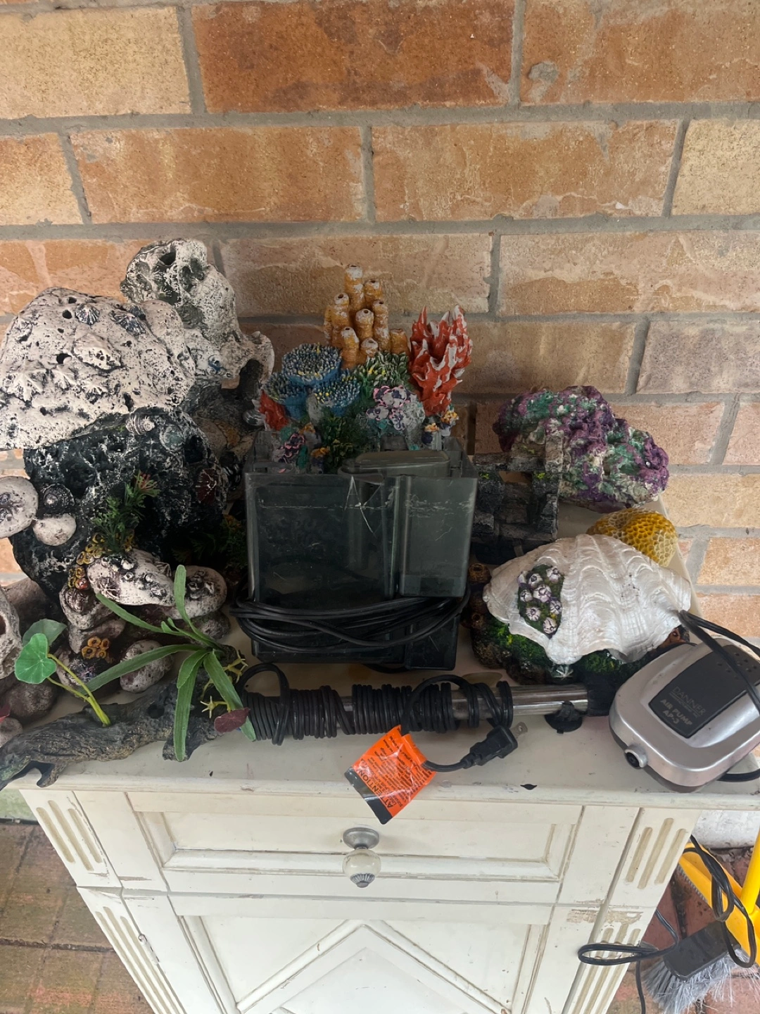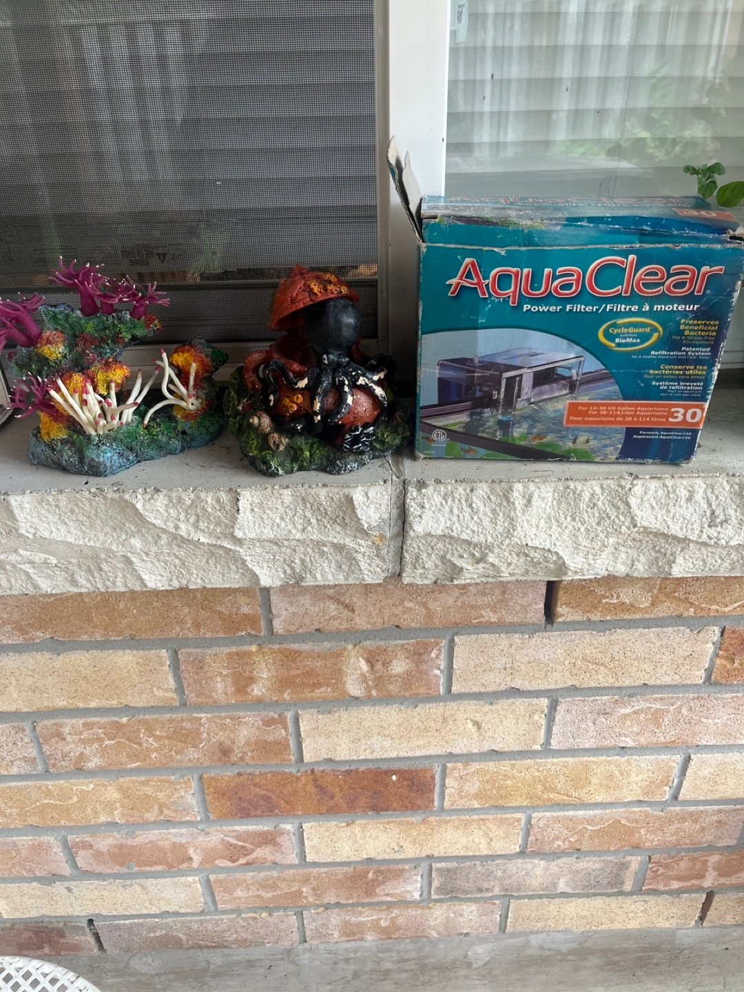 68Selling my Full aquarium set up. The filter is an AquaClear Power Filter and is suitable for a 30-gallon tank, I have a heater and air pump as well. There are 3 bubblers in the decor (the pearl, octopus in divers helmet, coral) Lots of decorations to make your aquarium look lively. The tank included is a long standing hexagon tank. Perfect for vertical swimmers ( I had my discus in here). There is white sand on the bottom. I love my fish tank and sad to see it go. Must sell due to downsizing in home