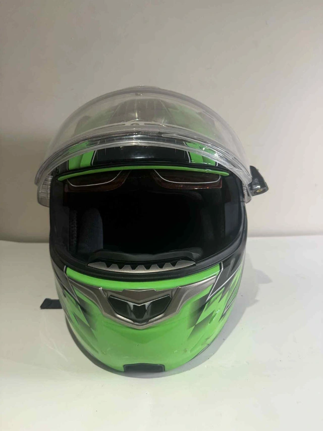 Stay protected and stylish with this full-face motorcycle helmet — sleek design and ready for riding. Full visor. Quick-release strap. Green/black racing graphics. Clean padded interior. Approx. Size: Medium/Large. Excellent condition. No major wear, visor is clear. Lightweight + secure fit. Great for motorcycles, e-bikes, ATVs, or karting setups. Note: All items have been opened and visually checked. They appear to be new. However, if you experience any issues or notice a missing piece, please contact us. We're happy to resolve it with a partial or full refund where appropriate. Thank you. Message directly here or call/text 289-788-8085 with any questions — happy to help. They’re not just Good Finds — they’re GREAT FINDS! Looking to grab a few things? Ask us about bundle discounts.
