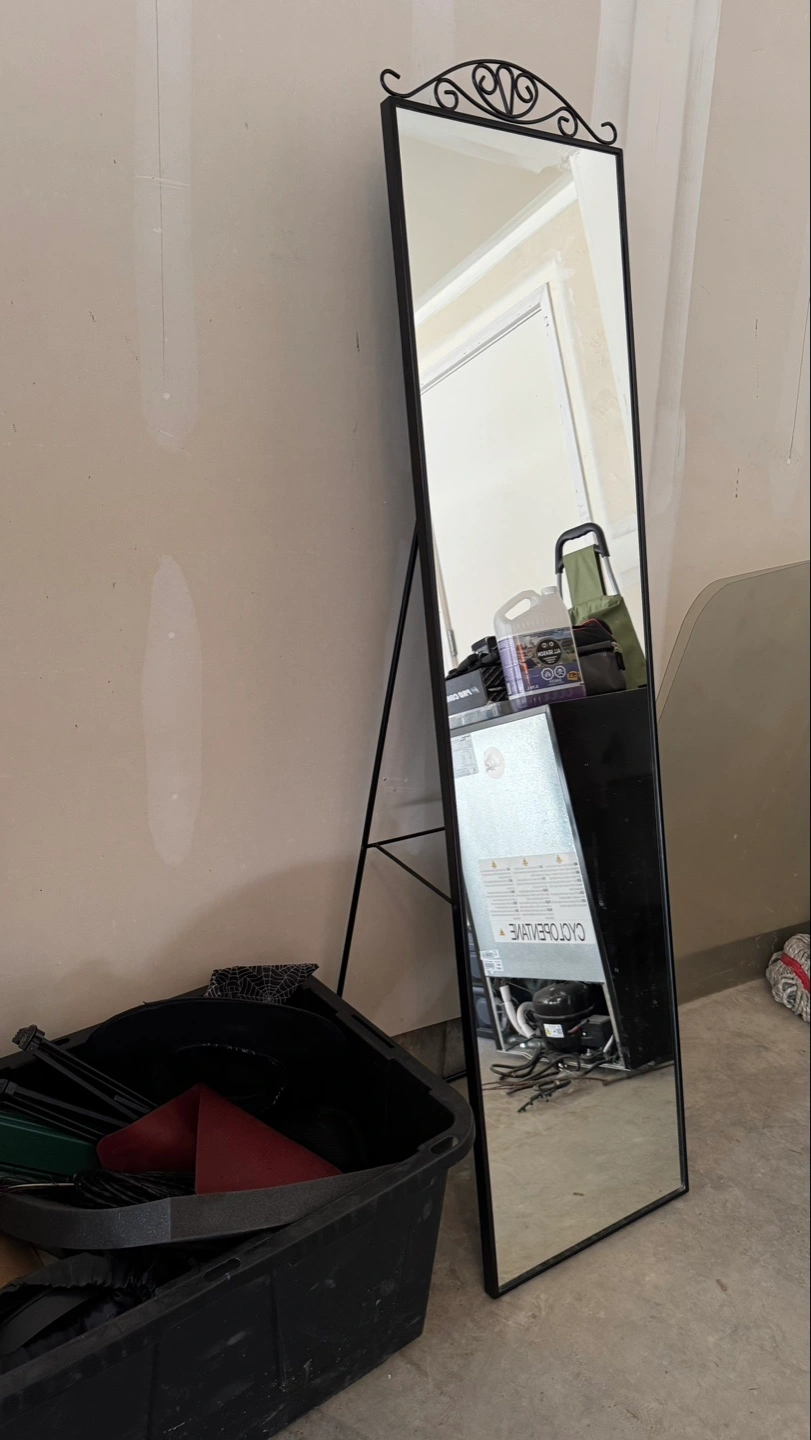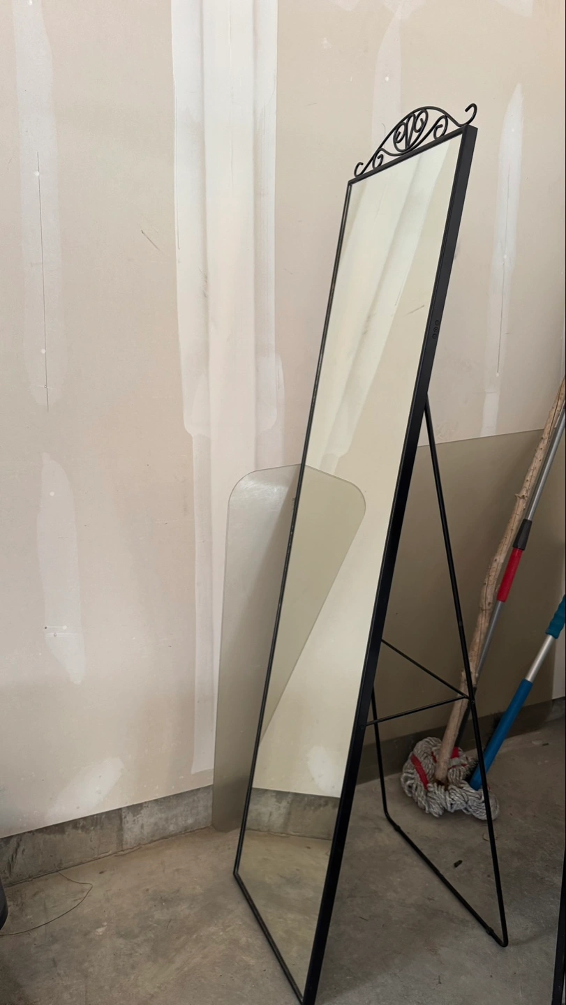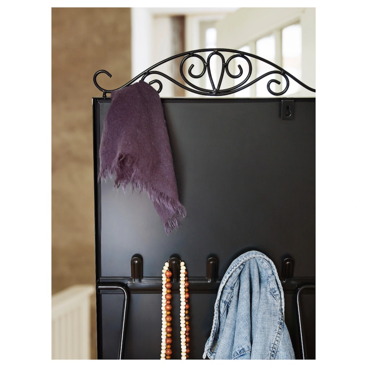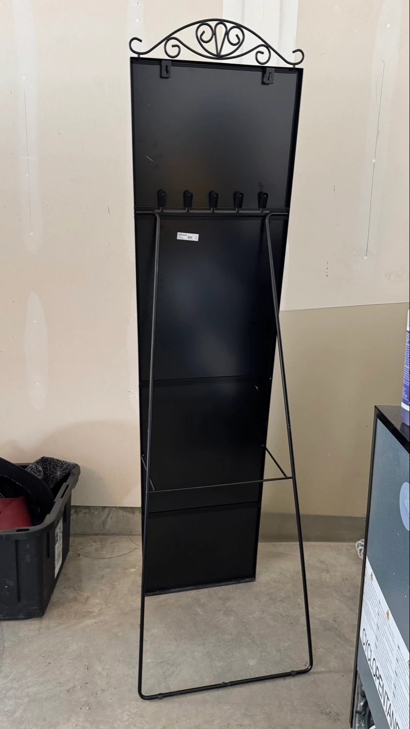 Tall free-standing mirror. Black metal frame with decorative top. Features a simple A-frame stand. Hanging hooks at the back for purses or jewelleries. Good for a bedroom or dressing room.