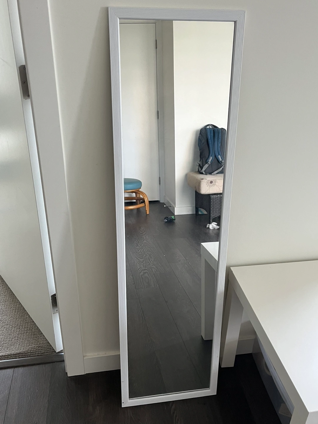 19A long, narrow mirror. The frame is white with vertical ridges. A perfect item to check yourself out before you head out the door, don't you think?