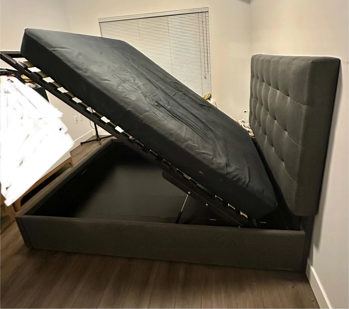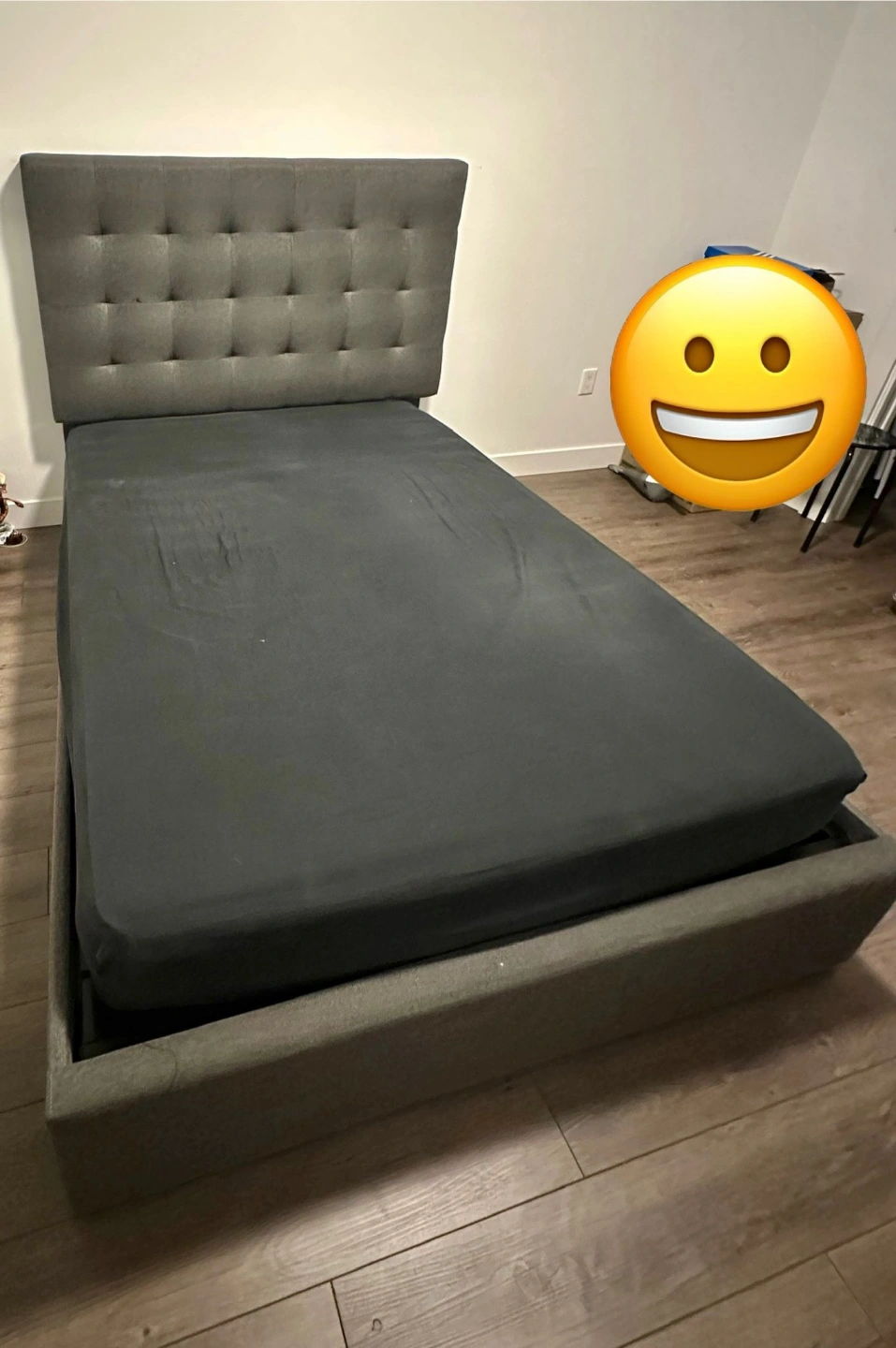 70Full size bed with grey fabric upholstery frame, button-tufted headboard. Hydraulic lift mechanism for storage. Minimal assembly required. Mattress included. 133cm height of frame. Bought at The Bricks.
