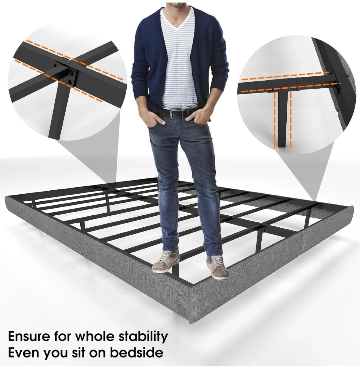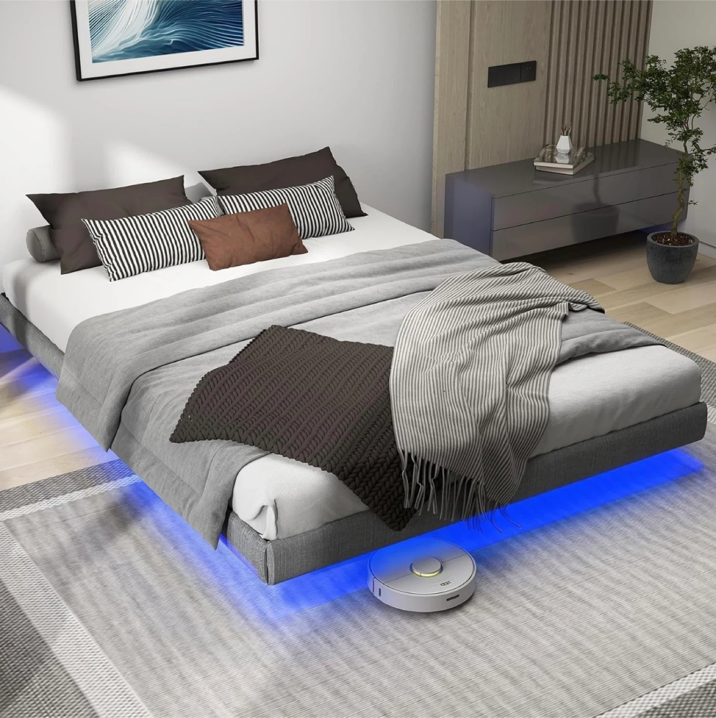 15Add a touch of colour to your room with this full-size smart RGB LED bed frame! It features anti-slipping fixtures, an embedded design to keep your mattress in place, and hidden support legs to avoid bumps. The fully upholstered wrap-around bed frame is easy to assemble and doesn't squeak. It has a max weight capacity of 1200 lbs and is recommended for a height of 27cm.