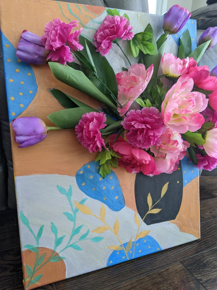 A colourful canvas painting with a 3D flower arrangement. A perfect piece of art to add some life to your home decor.