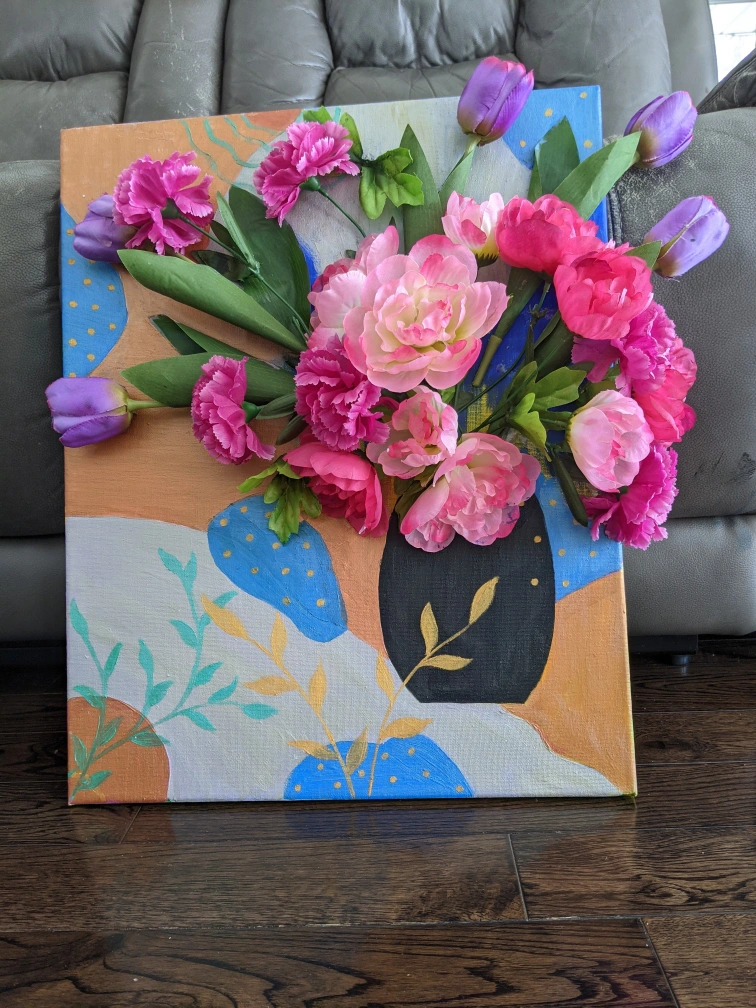 A colourful canvas painting with a 3D flower arrangement. A perfect piece of art to add some life to your home decor.