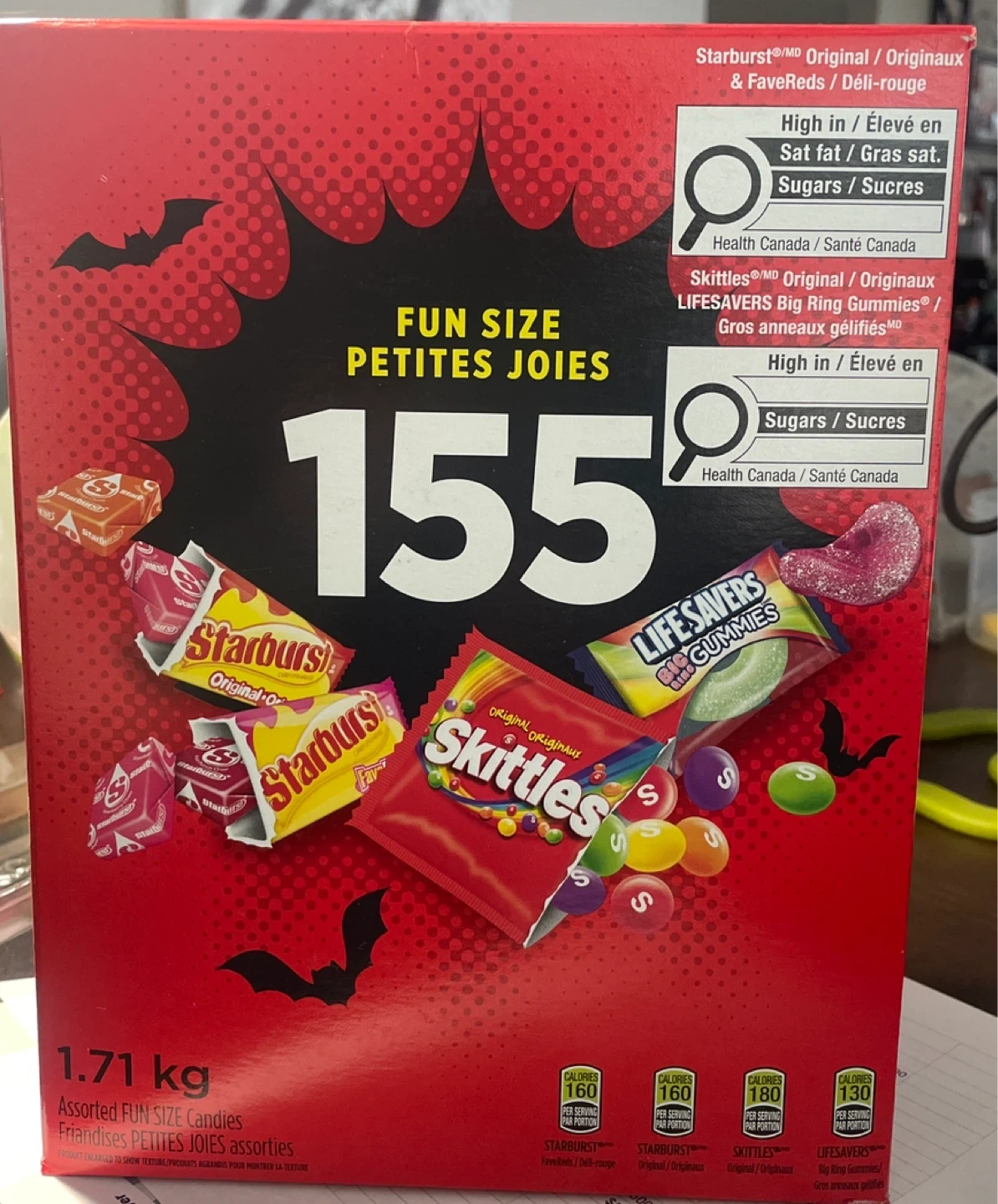 71Selling a 1.71 kg box of assorted fun-size candies! It includes Starburst Original & FaveReds, Skittles Original, and Lifesavers Big Ring Gummies. Perfect for sharing or Halloween treats! $44.50 in Amazon