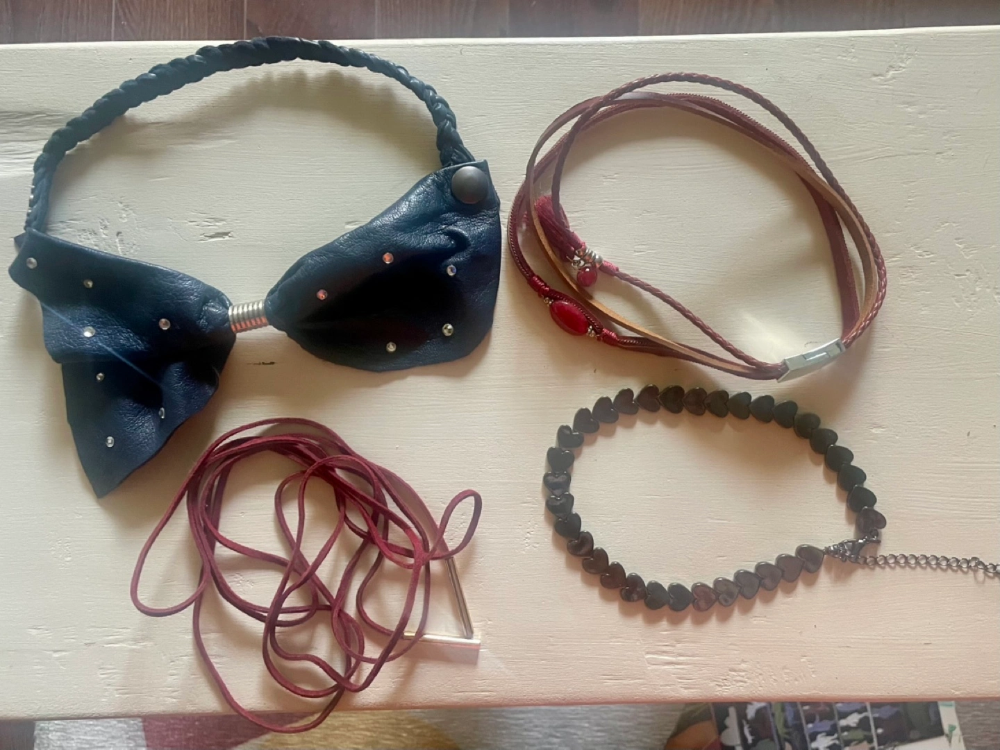 Fin choker assortment. Blue Leather collar choker - $25 Red Artisan Made Leather Choker with Magnetic clasp - $15 Red Leather String wrap choker - $5 Black Heart Choker - $10 $45 for the whole lot. Pick up around Sherbourne / Wellesley Could ship/ driver for a fee