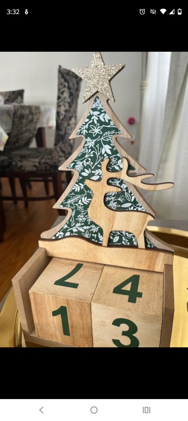 This decorative wooden calendar features a Christmas tree design with a reindeer. It includes numbered blocks to count down the days. It's perfect for adding some festive charm to your home this holiday season!