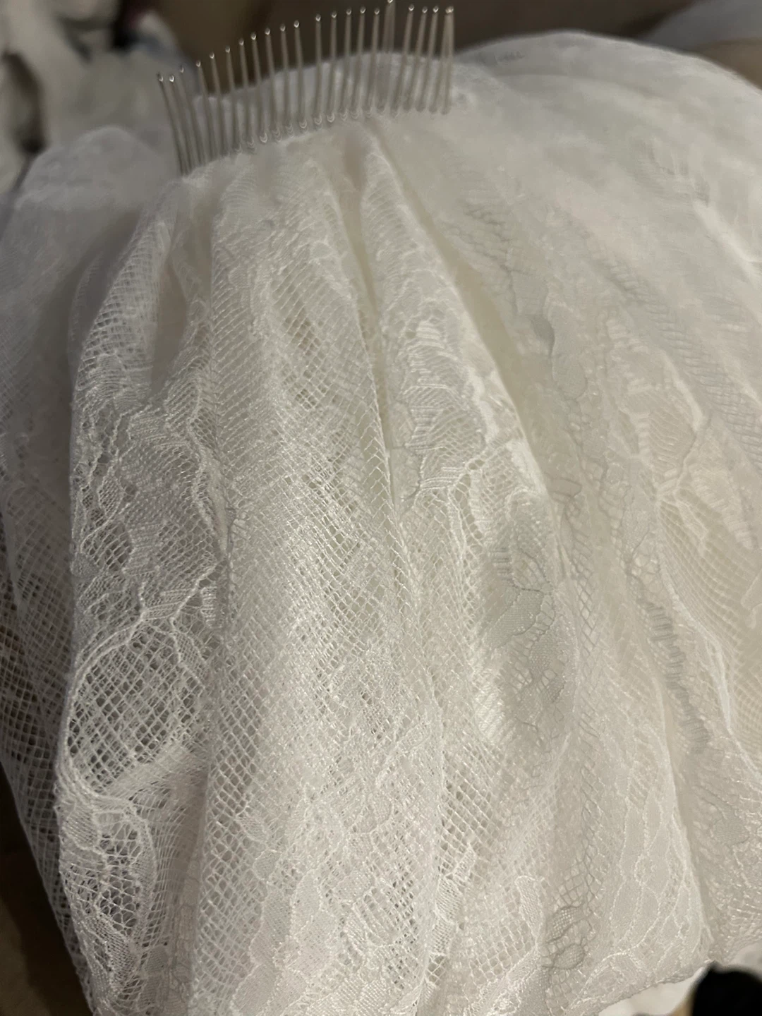 Selling a beautiful white lace wedding veil. It's in great condition and would be perfect for your special day! The lace detailing is really delicate and pretty.