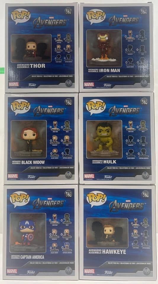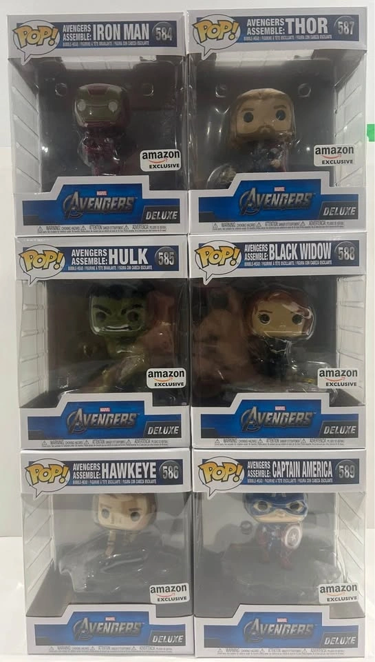18Funko Pop! Deluxe Pops Avengers Assemble Full Set **Amazon Exclusive** #584 - Iron Man #585 - Hulk #586 - Hawkeye #587 - Thor #588 - Black Widow #589 - Captain America Pick up Barrie after hours and weekends Toronto at 161 Bay Street Mon to Fri 8:30am to 3:30pm