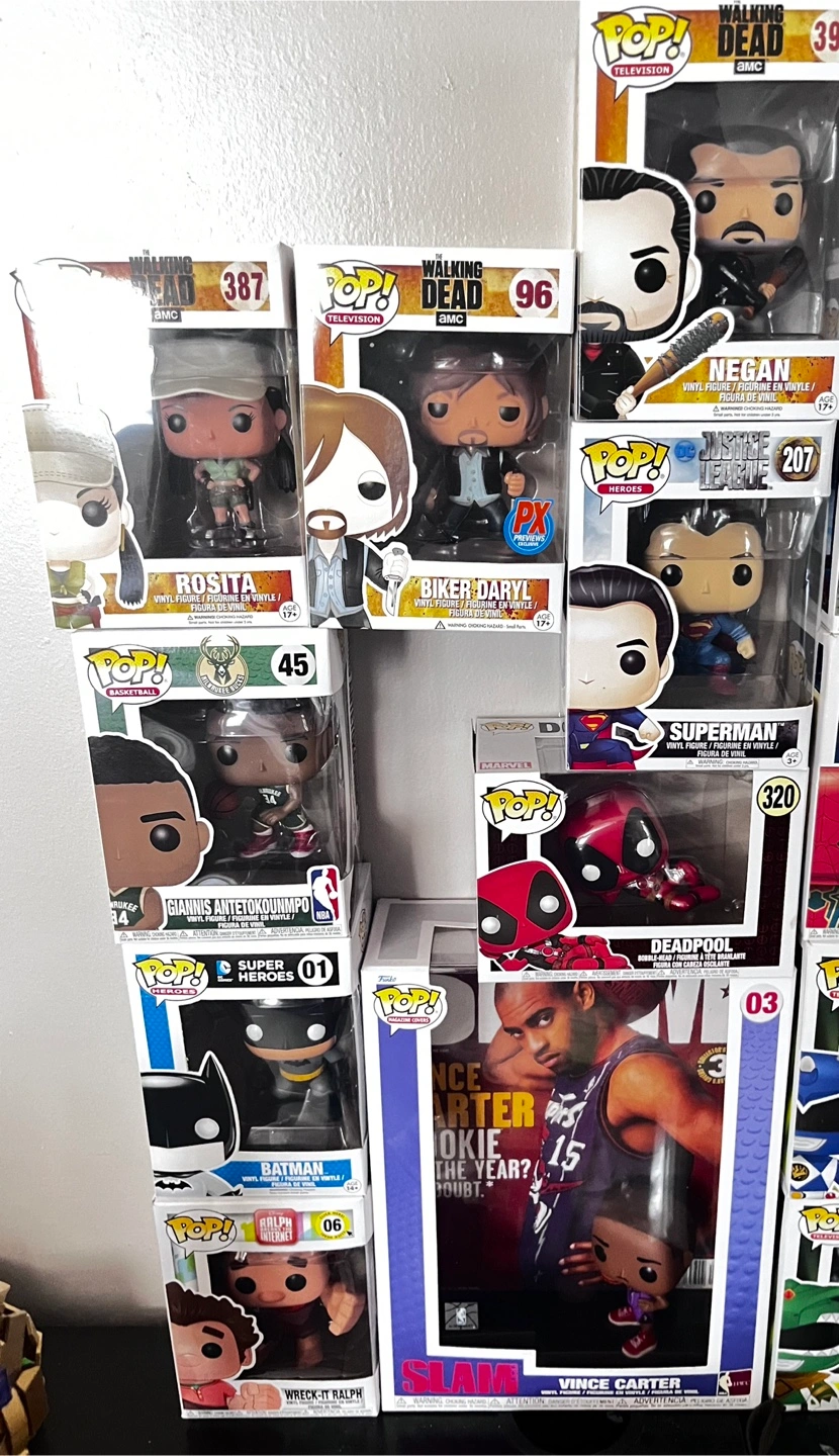 A collection of Funko POP! figures. Features many pop culture characters, from movies and television to sports and games. These figures are a great way to decorate your space and show off your interests.