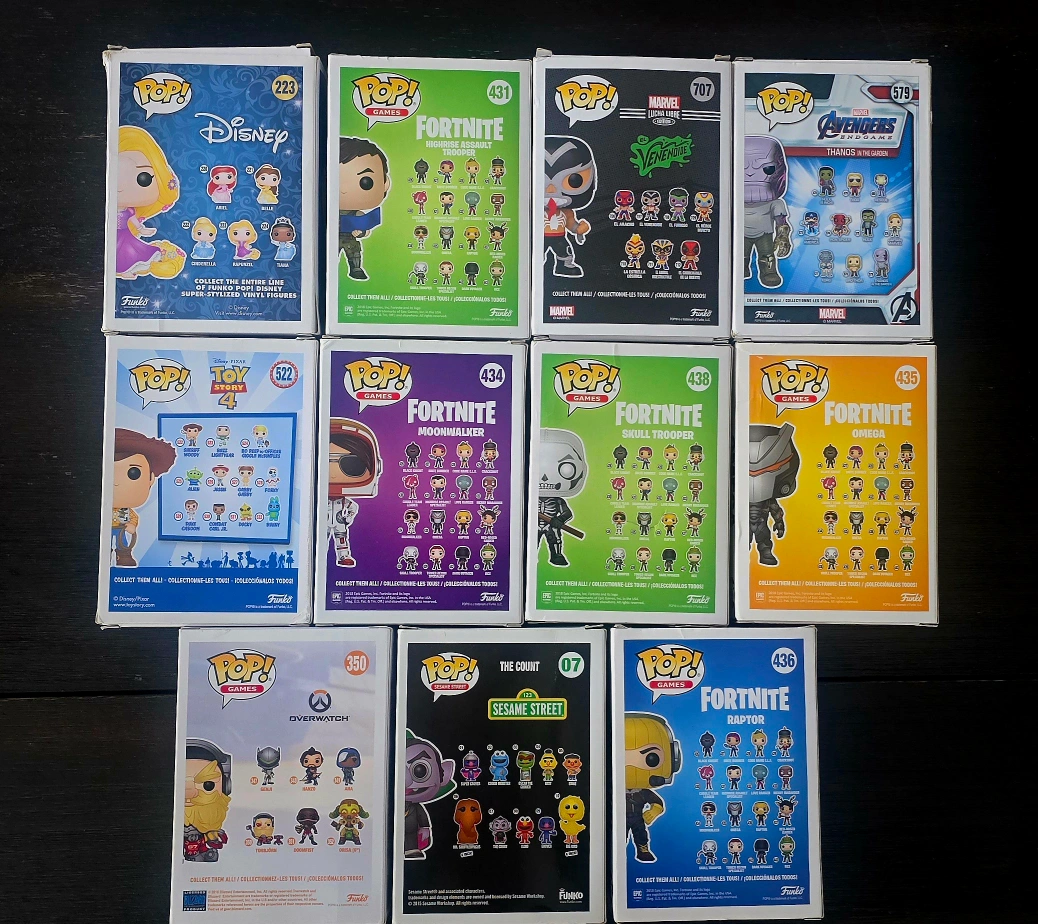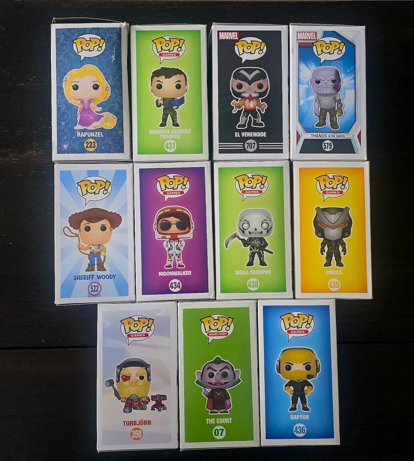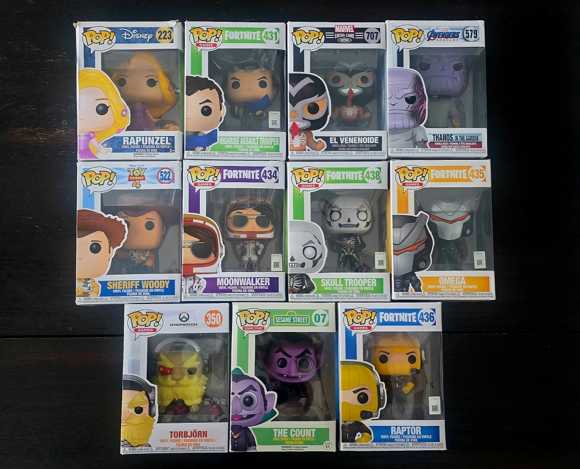 78Selling a collection of Funko Pop! figures! Characters include Rapunzel, Highrise Assault Trooper, El Venenoide, Thanos, Sheriff Woody, Moonwalker, Skull Trooper, Omega, Torbjörn, The Count, and Raptor. Great for collectors!