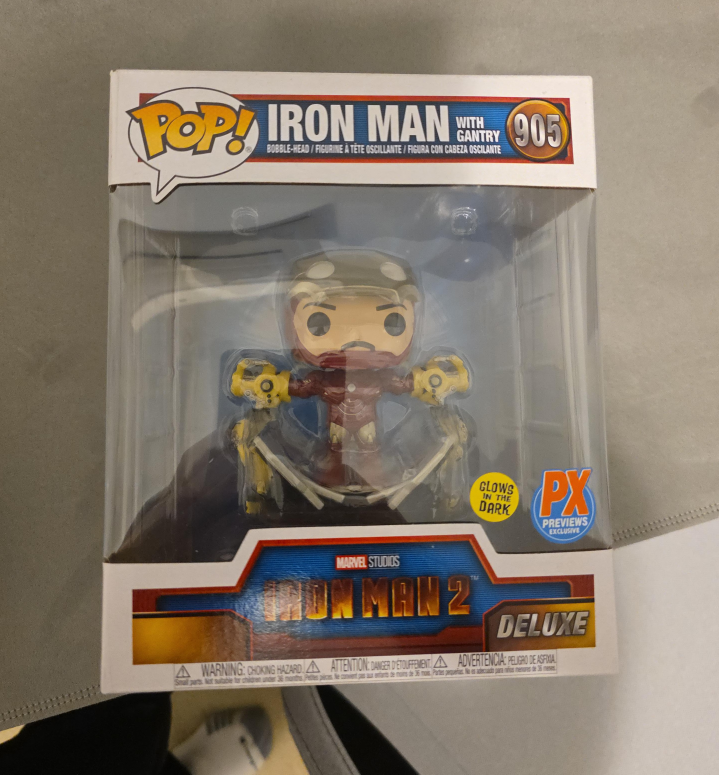 10Selling a Funko Pop! Iron Man with Gantry, number 905. This is the deluxe version and it even glows in the dark! A cool collectible for any Marvel fan
