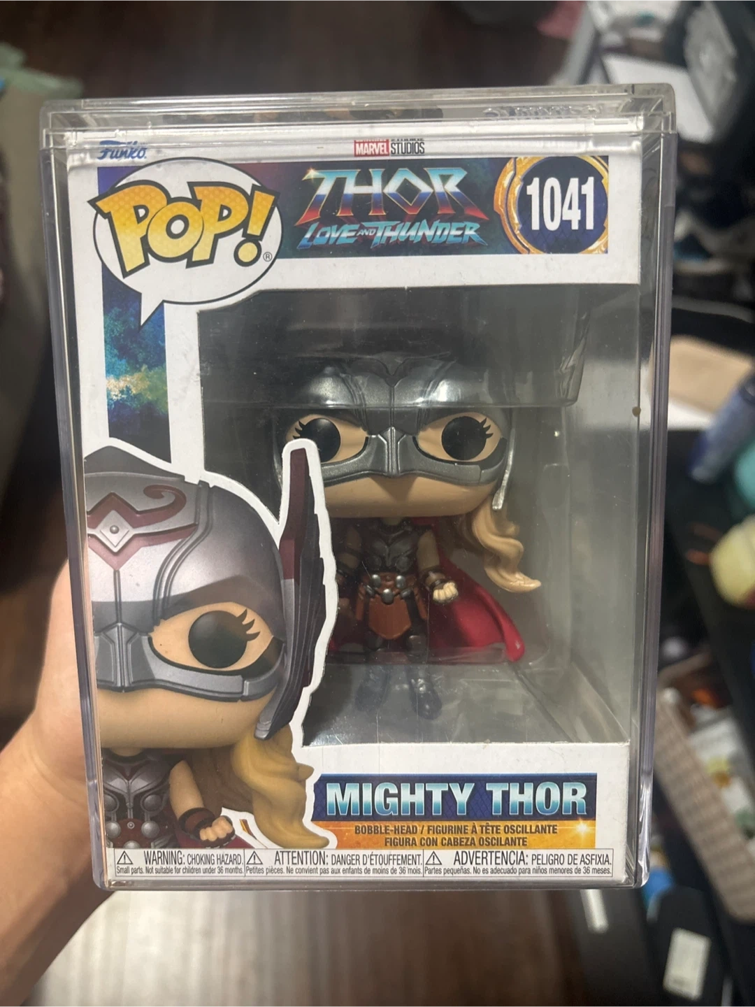 Selling a Funko Pop! figure of Mighty Thor from Marvel's Thor: Love and Thunder movie. This is figure number 1041 in the Pop! series. It's a bobble-head figure and comes in its original box as well as a plastic hard box!