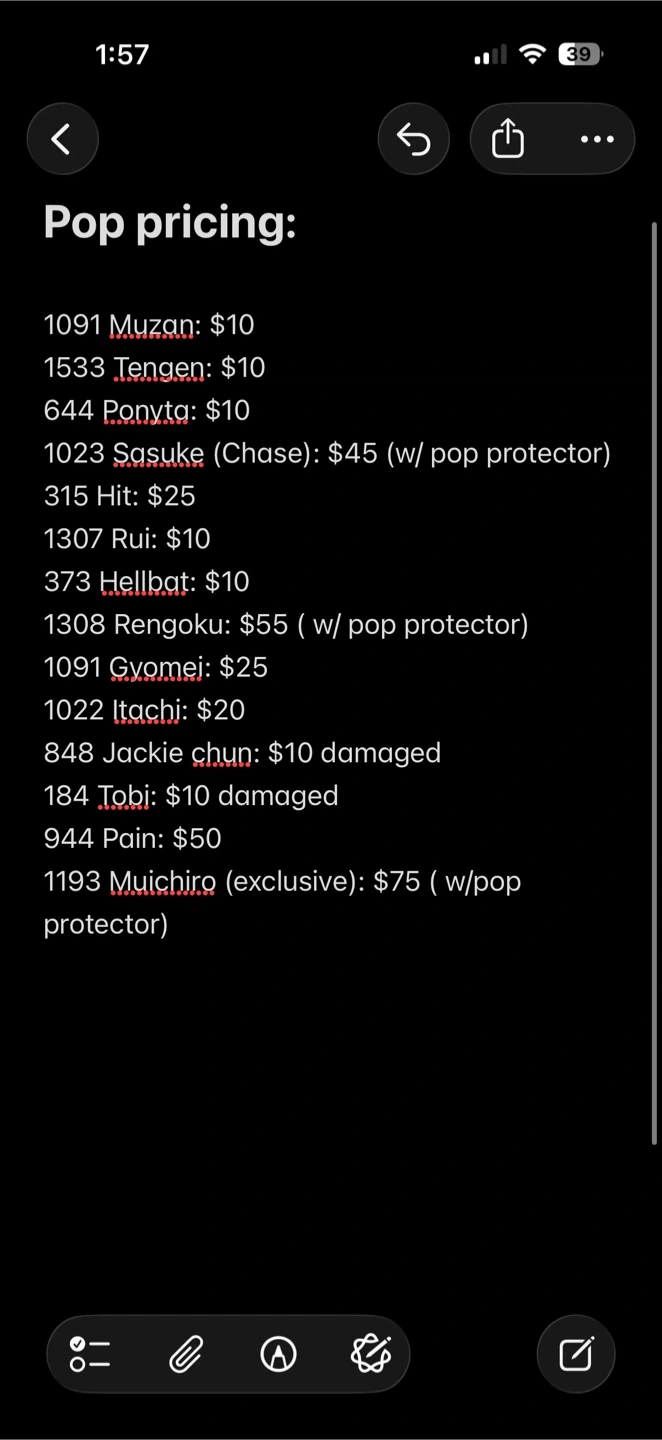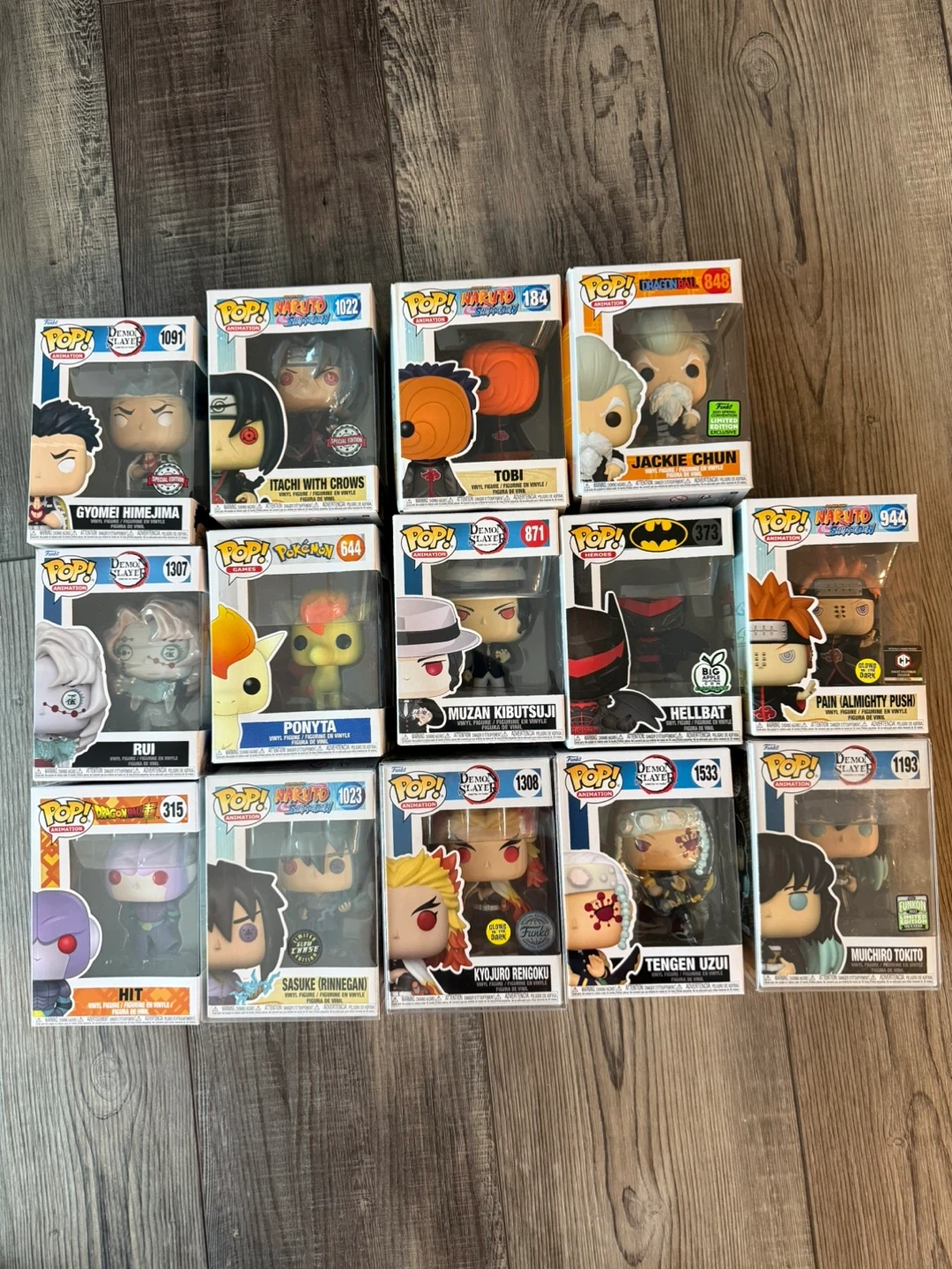 60Selling my collection of Funko Pop! vinyl figures. Perfect for any anime fan or collector! Priced individually as listed in the second photo. 1091 Muzan: $10 1533 Tengen: $10 644 Ponyta: $10 1023 Sasuke (Chase): $45 (w/ pop protector) 315 Hit: $25 1307 Rui: $10 373 Hellbat: $10 1308 Rengoku: $55 ( w/ pop protector) 1091 Gyomei: $25 1022 Itachi: $20 848 Jackie chun: $10 (box damage) 184 Tobi: $10 (box damage) 944 Pain: $50 1193 Muichiro (exclusive): $75 ( w/pop protector) Will update ad with each sale. Currently, they’re all available.