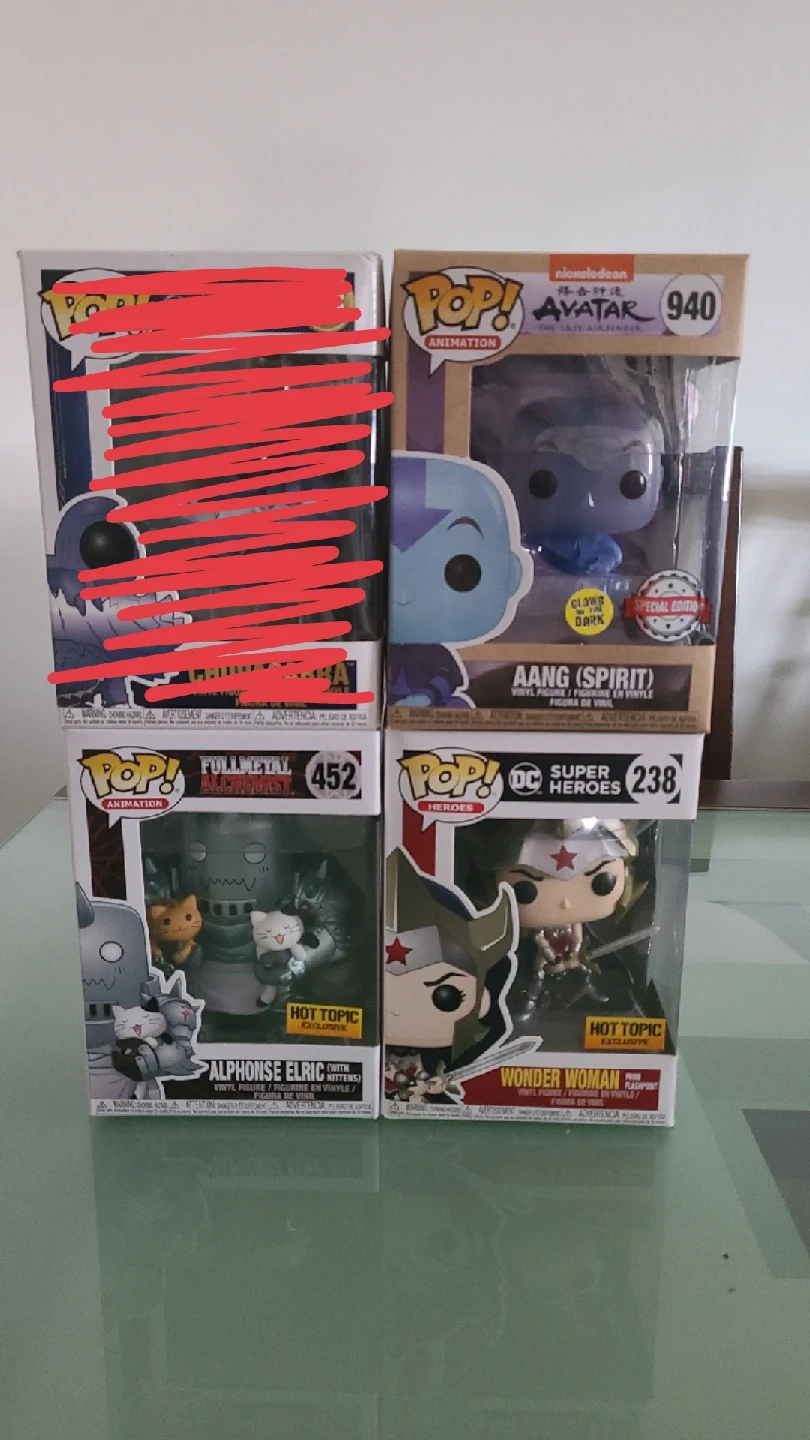 73Selling a set of Funko Pop! vinyl figures. Included are: - Chupacabra (Crimes of Grindelwald #18) - SOLD - Aang (Spirit) (Avatar #940) - Glows in the dark, Special Edition - Alphonse Elric with Kittens (Fullmetal Alchemist #452) - Hot Topic Exclusive - Wonder Woman from Flashpoint (DC Super Heroes #238) - Hot Topic Exclusive Prices for each.