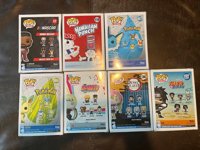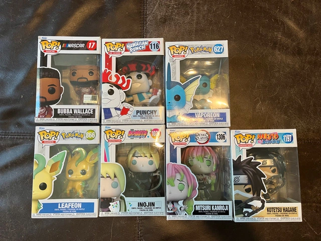 10Selling a small collection of Funko Pops, all in excellent condition with boxes intact. Perfect for collectors or as gifts. Included Pops: Bubba Wallace (NASCAR #17), Punchy (Hawaiian Punch Ad Icon #116), Vaporeon (Pokémon #627), Leafeon (Pokémon #866), Inojin (Boruto: Naruto Next Generations #1038), Mitsuri Kanroji (Demon Slayer #1306), Kotetsu Hagane (Naruto Shippuden #1197). All are brand new, kept in original boxes. Boxes are in very good condition with minimal shelf wear.