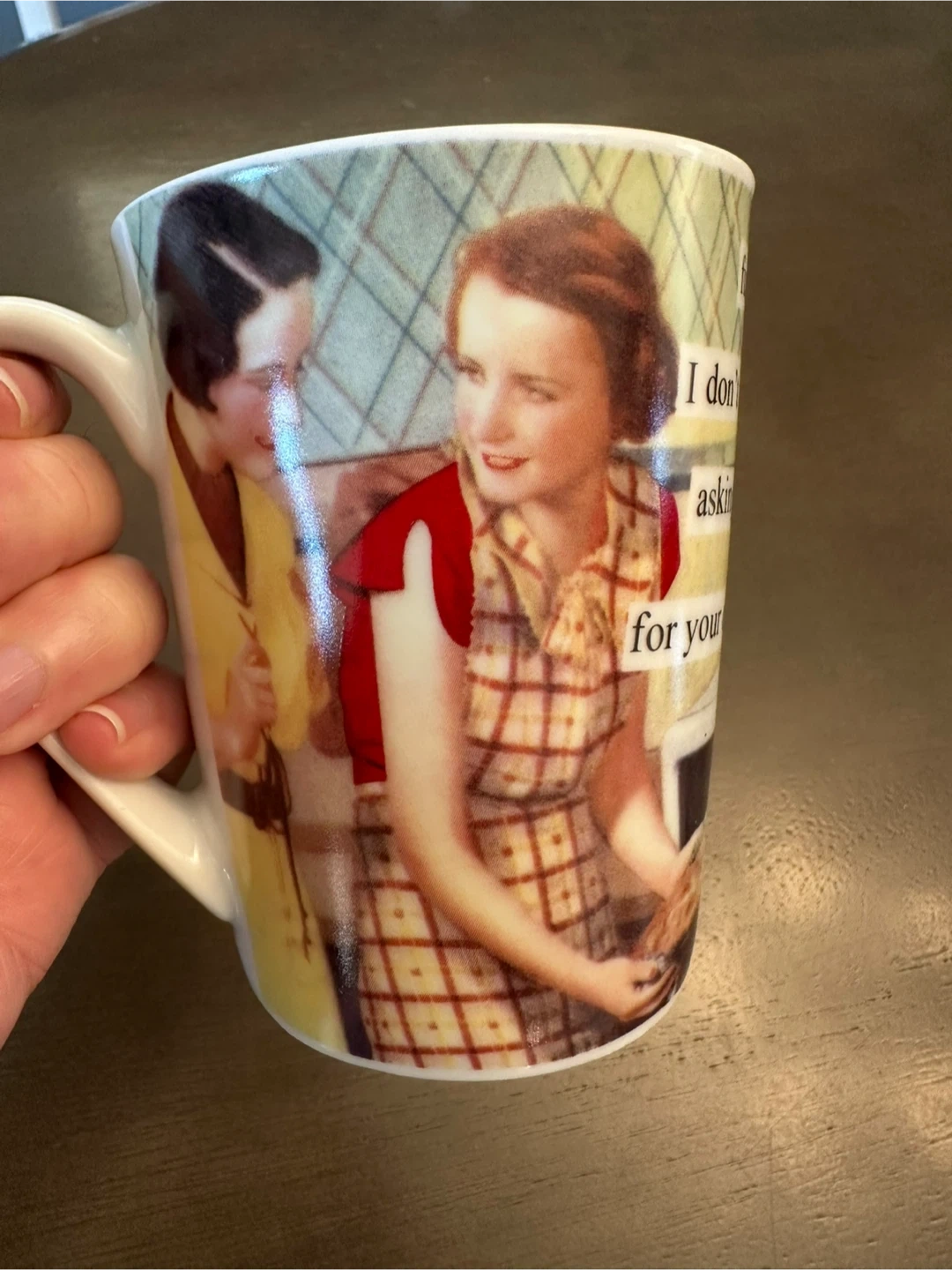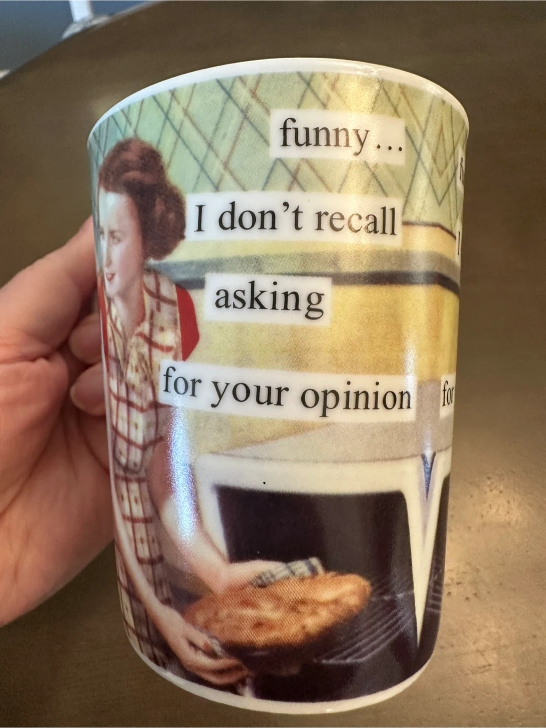 41Funny…I don’t recall asking for your opinion Mug! Here's a fun mug from Anne Taintor, Inc! It's made of porcelain and is both dishwasher and microwave safe. The mug features funny sayings and vintage-style illustrations. A great addition to your collection!