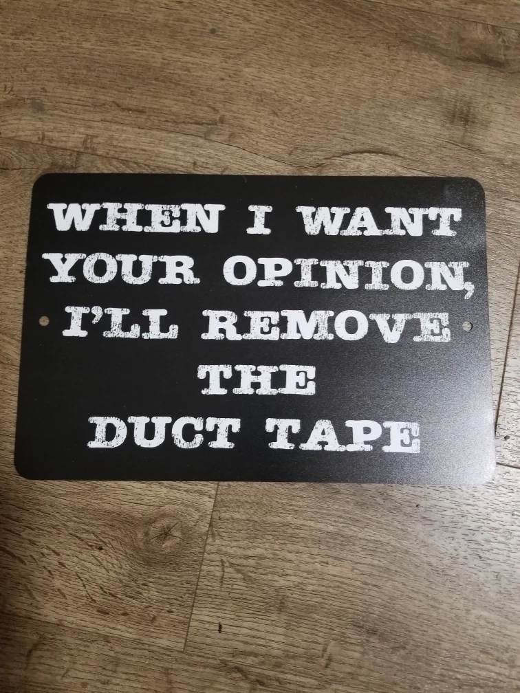 240Selling a funny metal sign that reads: "WHEN I WANT YOUR OPINION, I'LL REMOVE THE DUCT TAPE"! It's brand new and ready to add some humour to your space 8x12