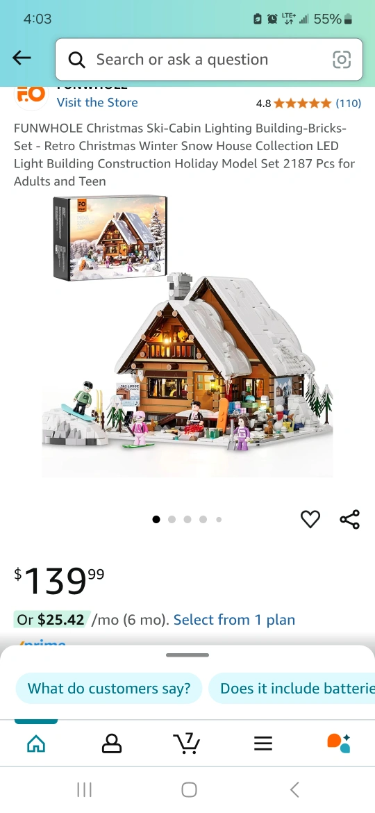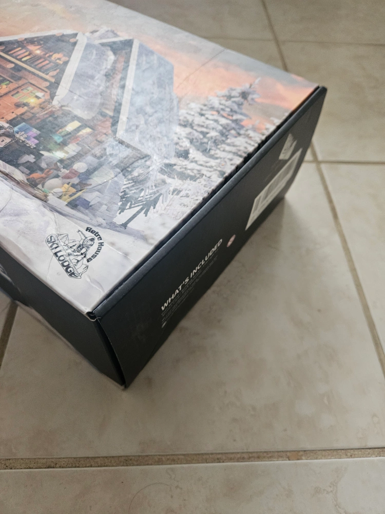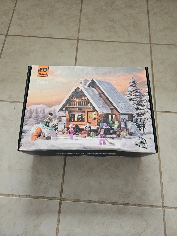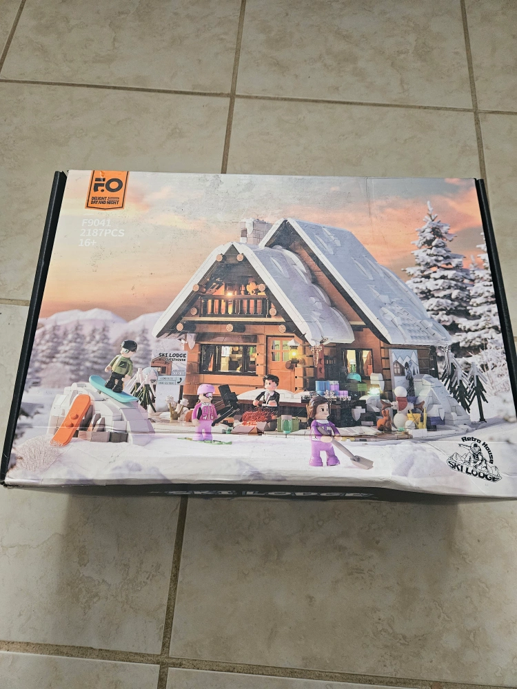 107Brand New / Sealed FUNWHOLE Christmas Ski-Cabin Lighting Building-Bricks-Set - Retro Christmas Winter Snow House Collection LED Light Building Construction Holiday Model Set 2187 Pcs for Adults and Teen Winter Holiday Scene: The entire cabin is set in a snowy Christmas holiday atmosphere, with thick snow covering the roof and ground. A snowman, cleaning tools, and snowballs add playful details, enhancing the wintery charm of this festive house. Classic Winter Chalet: This Nordic-style chalet is designed as a ski holiday lodge, featuring a reservation sign at the entrance and a large ski resort poster on the side, capturing the essence of a cozy snow-covered winter retreat. Winter Ski Excitement:Experience the excitement of winter skiing with mini figures equipped with ski helmets, skis, poles, and snow boots. The figures can stand on skis, and by turning a side knob, they move to mimic real skiing action, bringing the snowy holiday cabin scene to life. Cozy Christmas Gathering: Inside the cabin, a fireplace serves as the focal point, surrounded by sofas and a coffee table with board games, a gaming console, and pizza, creating a warm Christmas gathering atmosphere perfect for winter holidays with friends. Interactive Winter Details: The cabin features movable designs like snow sliding off the roof to create a larger ski slope. Underneath the snow, there’s a hidden rabbit hole with two carrots, and removing the second-floor roof reveals a squirrel stealing pizza, adding fun surprises to the snowy christmas scene. Exclusive Lighting Design (Batteries Not Included): Featuring four sets of string lights and ten custom lighting points, including a campfire, two wall lamps, a floor lamp, a fireplace, a heater, a table lamp, and three ceiling lights. The warm white glow enhances the cozy and peaceful atmosphere throughout the cabin.
