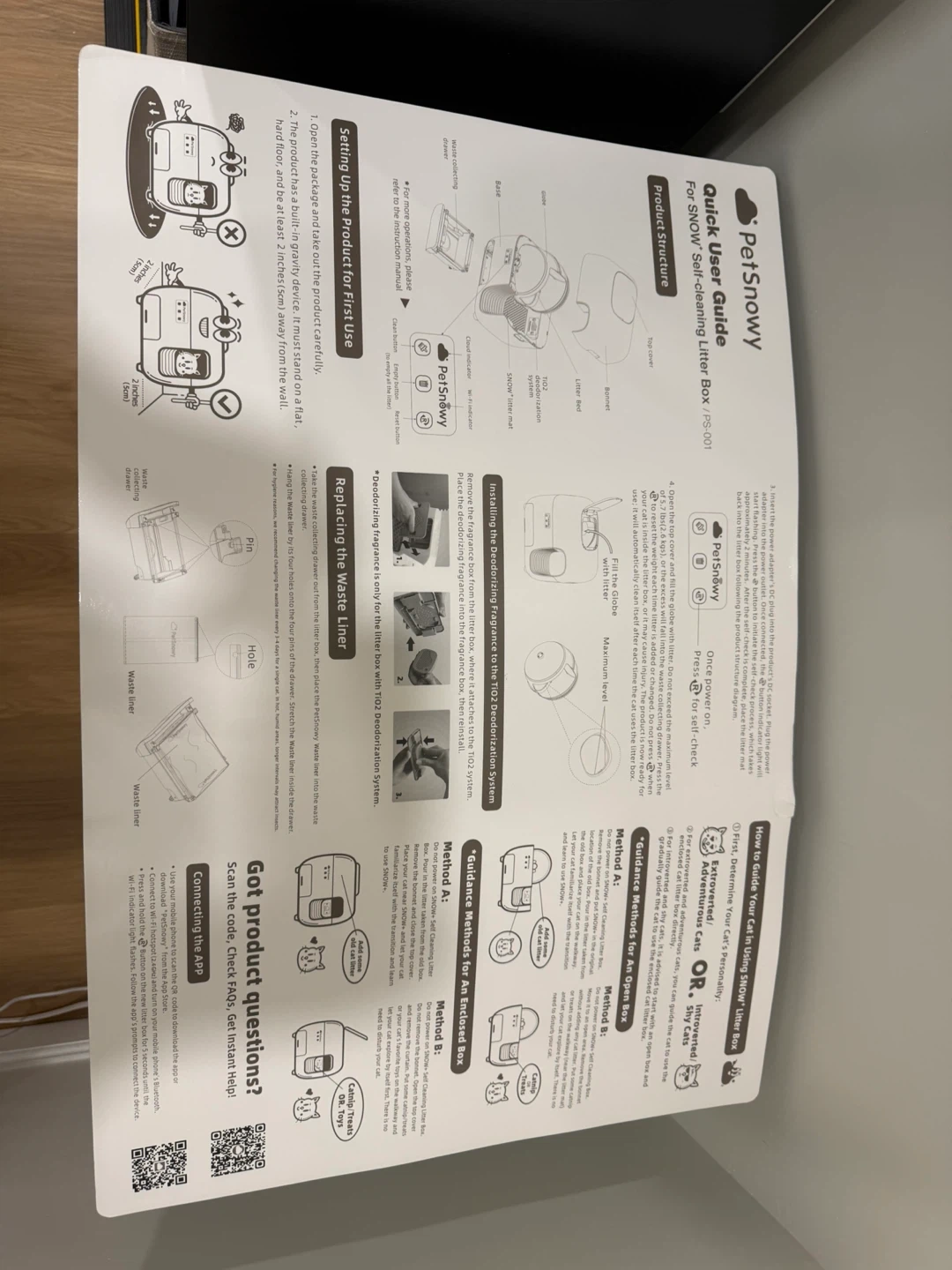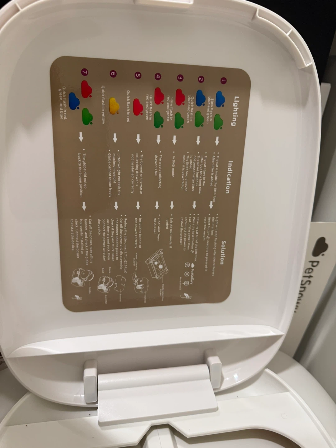 This is a PetSnowy self-sealing automatic cat litter box. It features an enclosed design with a waste drawer. The unit includes indicator lights for status. It's designed for automated waste management. My cat didn’t like the new litter box. She’s been using her regular litter box instead. She hasn’t adjusted to the change. Comes with all the accessories. The box will be emptied for pickup.