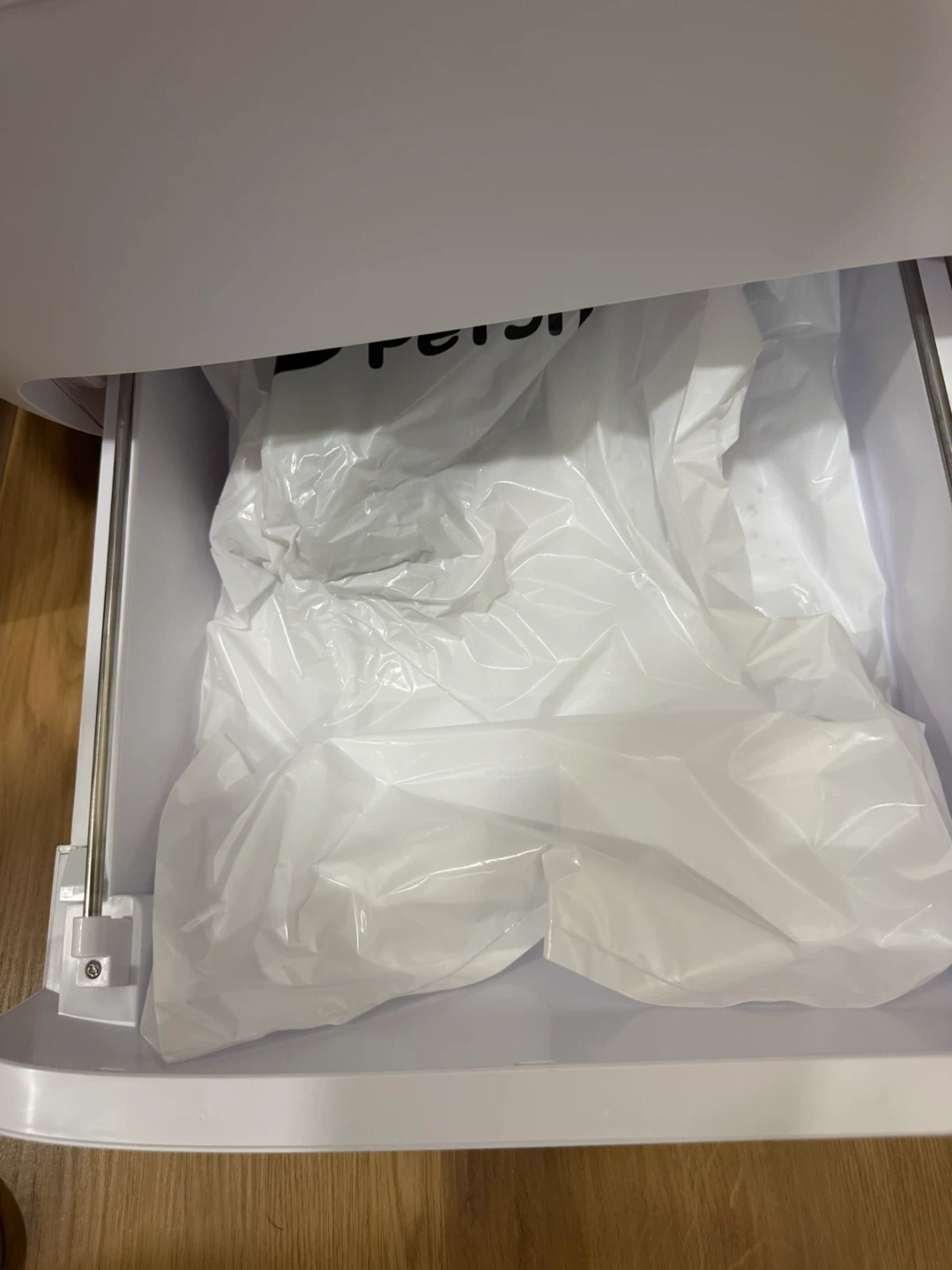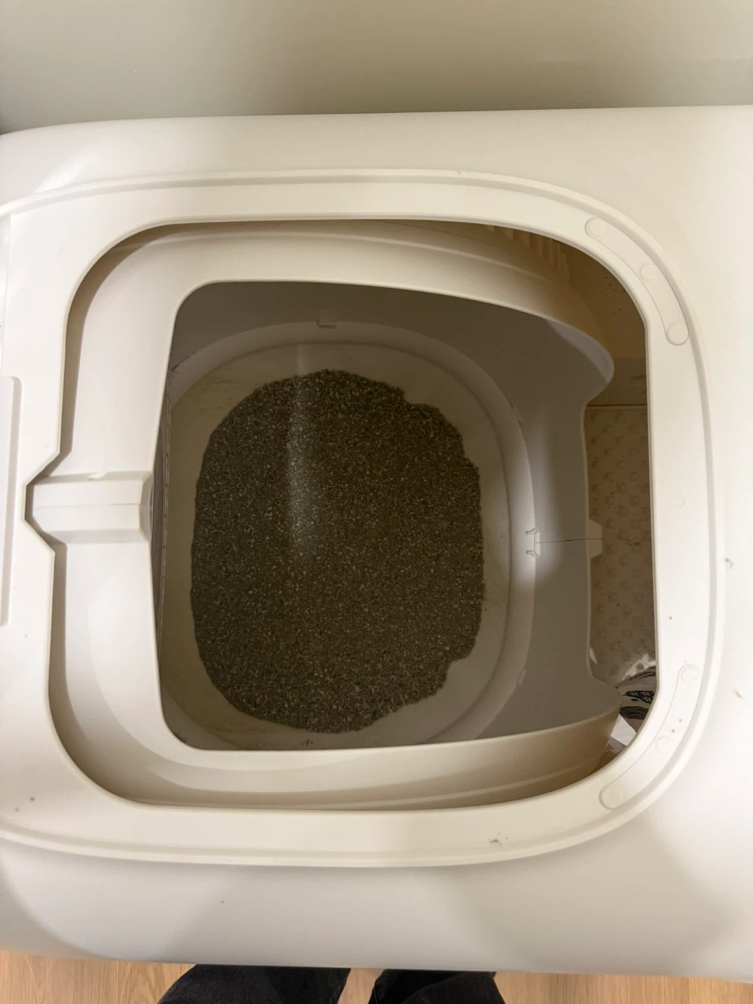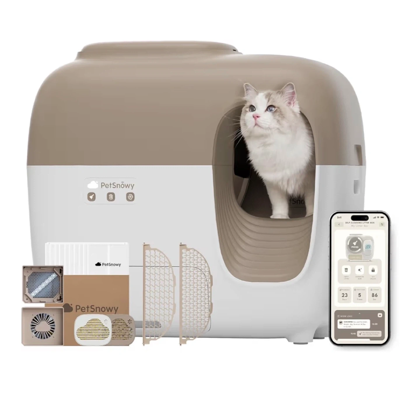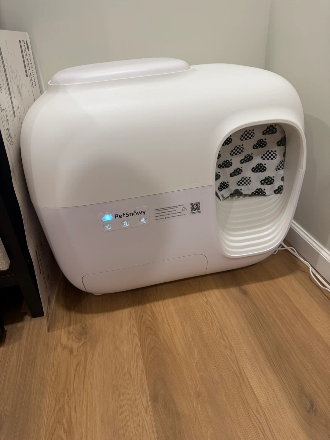 This is a PetSnowy self-sealing automatic cat litter box. It features an enclosed design with a waste drawer. The unit includes indicator lights for status. It's designed for automated waste management. My cat didn’t like the new litter box. She’s been using her regular litter box instead. She hasn’t adjusted to the change. Comes with all the accessories. The box will be emptied for pickup.